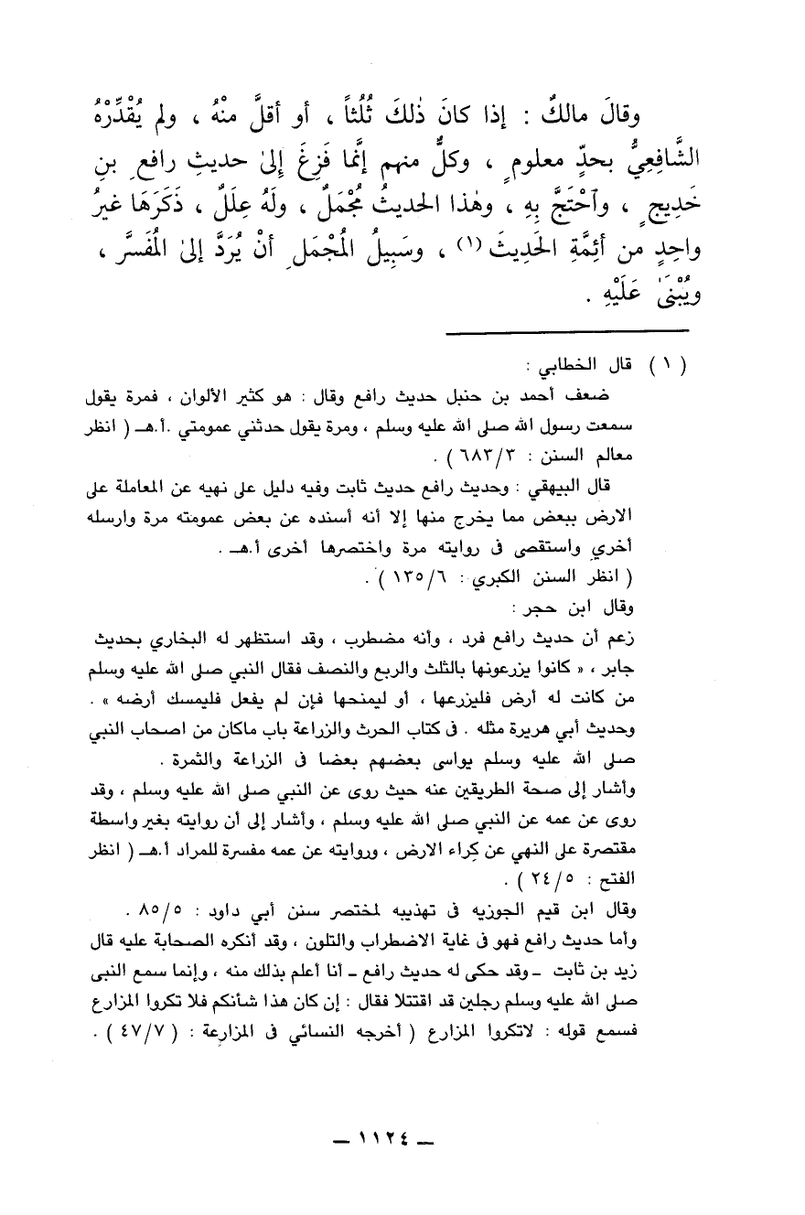وقال مالك: إذا كان ذلك ثُلُثا , أو أقل منه , ولم يُقدّره الشَّافعي بحدّ معلوم , وكل منهم إنما فزِع إلى حديث رافع بن خَديج , واحتَجّ به , وهذا الحديث مُجْمَل , وله عِلل , ذكرها غير واحد من أئمة الحديث , وسبيل المُجْمَل أن يُرَدّ إلى المُفَسَّر , ويُبنى عليه.