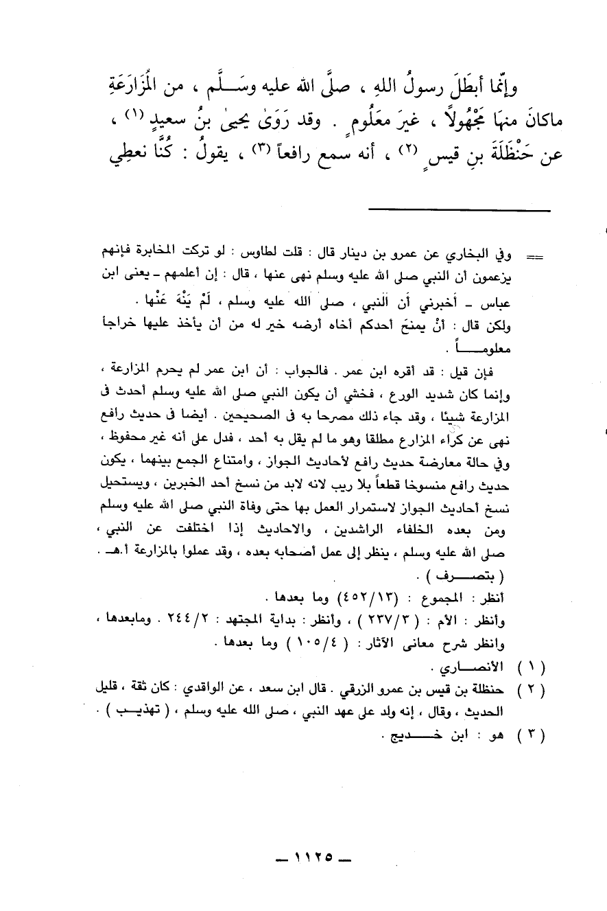 وإنما أبطل رسول الله , صلى الله عليه وسلم , من المُزارعة ما كان مجهولا , غير معلوم. وقد رَوى يحيى بن سعيد , عن حنظلة بن قيس , أنه سمع رافعاى , يقول: كُنا نُعطي
