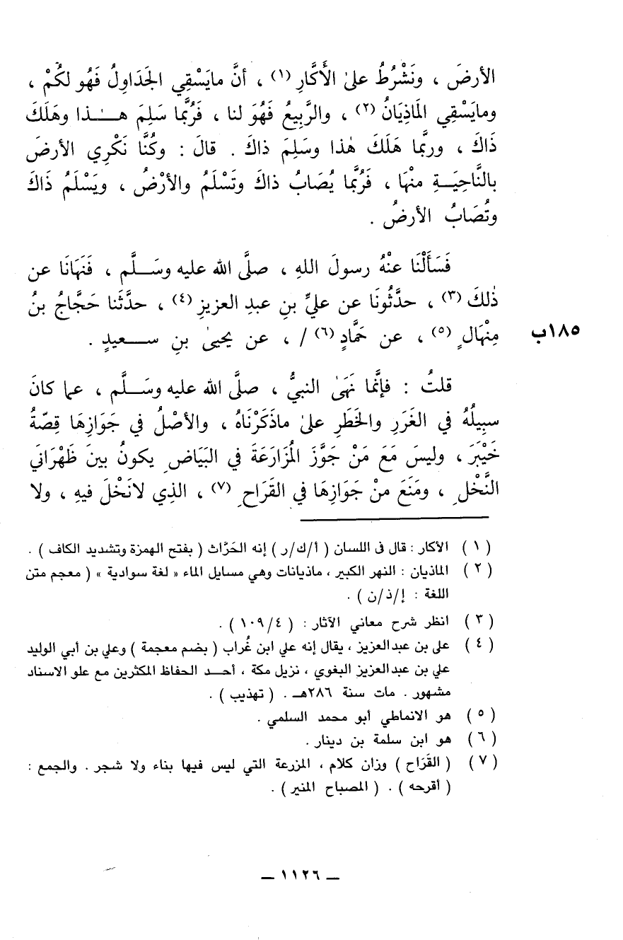 الأرض , ونَشرط على الأَكَّار , أن ما يَسْقي الجداول فهو لكم , وما يَسْقي الماذِيان , والربيع فهو لنا , فربنا سَلِم هذا وهلَك ذاك. قال: وكُنا نَكْري الأرض بالناحية منها , فربما يُصاب ذاك وتَسْلم والأرض , ويَسْلم ذاك وتُصاب الأرض.