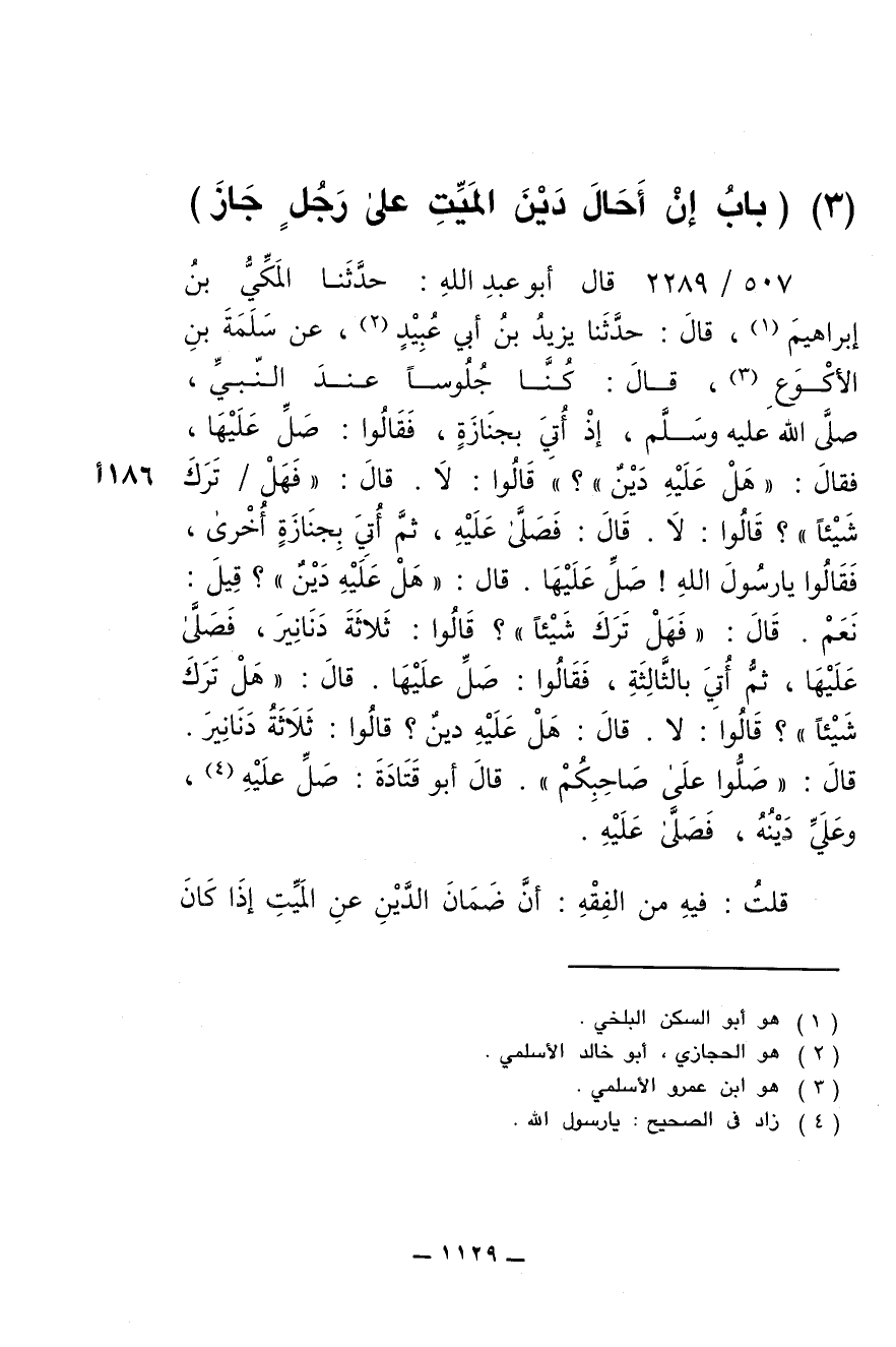 507/ 2289 - قال أبو عبد الله: حدّثنا المَكِّيّ بن إبراهيم , قال: حدّثنا يزيد بن أبي عُبيد , عن سَلَمة بن الأكوع , قال: كنا جُلوسا عند النبي , صلى الله عليه وسلم , إذ أُتِي بجنازة , فقالوا: صلِّ عليها , فقال: " هل عليه دَيْن "؟ قالوا: لا. قال: " فهل ترك شيئا "؟ قالوا: لا. قال: فصلى عليه , ثم أُتِي بجنازة أخرى , فقالوا يا رسول الله! صَلِّ عليها. قال: " هل عليه دَيْن "؟ قيل: نعم. قال: " فهل ترك شيئا "؟ قالوا: ثلاثة دنانير , فصلى عليها , ثم أُتِي بالثالثة , فقالوا: صلّ عليها. قال: " هل ترك شيئا "؟ قالوا: لا. قال: هل عليه دين؟ قالوا: ثلاثة دنانير. قال: " صلوا على صاحبكم ". قال أبو قَتادة: صَلِّ عليه , وعليَّ دينه , فصلى عليه.
