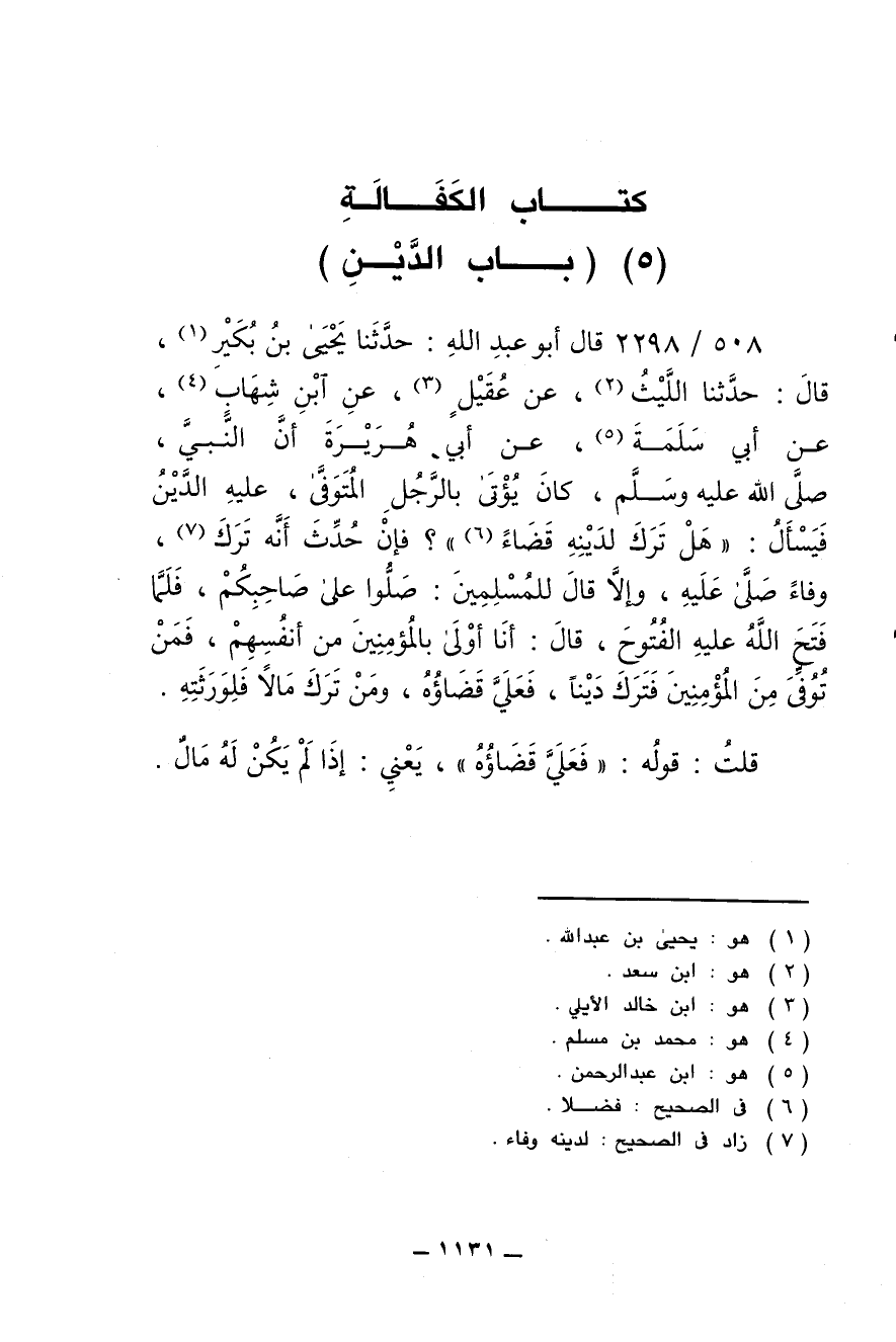 508/ 2298 - قال أبو عبد الله: حدّثنا يحيى بن بُكَير , قال حدّثنا الليث , عن عُقَيل , عن ابن شِهاب , عن أبي سَلَمة , عن أبي هريرة أن النبي , صلى الله عليه وسلم , كان يؤتى بالرجل المُتوفّى , عليه الدَّين فيَسْأل: " هل ترك لدَينه قضاء "؟ فإن حُدِّث أنه ترك , وفاء صلى عليه , وإلا قال للمُسلمين: صلُّوا على صاحِبكم , فلمّا فَتَح الله عليه الفتوح , قال: أنا أولى بالمؤمنين من أنفسهم , فمَن تُوُفِّي من المؤمنين فترك دَيْنا , فعليَّ قضاؤه , ومَن ترك مالا فَلِوَرِثته.
