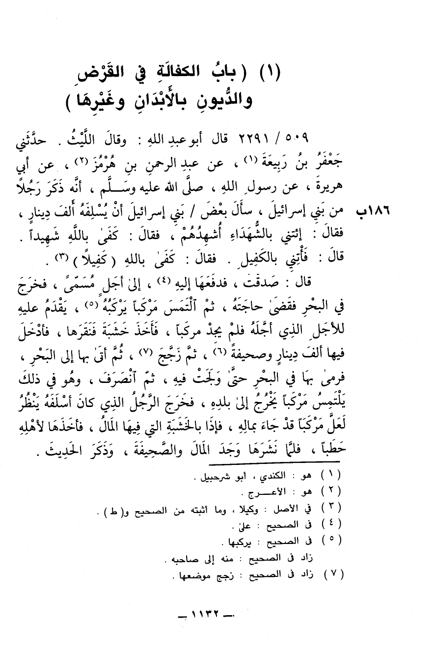 509/ 2291 - قال أبو عبد الله: وقال الليث: حدثني جعفر بن ربيعة , عن عبد الرحمن بن هُرمز , عن أبي هريرة , عن رسول الله , صلى الله عليه وسلم , أنه ذكر رجلا من بني إسرائيل , سأل بعض بني إسرائيل أن يُسْلِفَه ألف دينار , فقال: ائتِني بالشهداء أُشهِدهم , فقال: كفى بالله شهيدا. قال: فائتني بالكفيل. فقال: كفى بالله كفيلا.