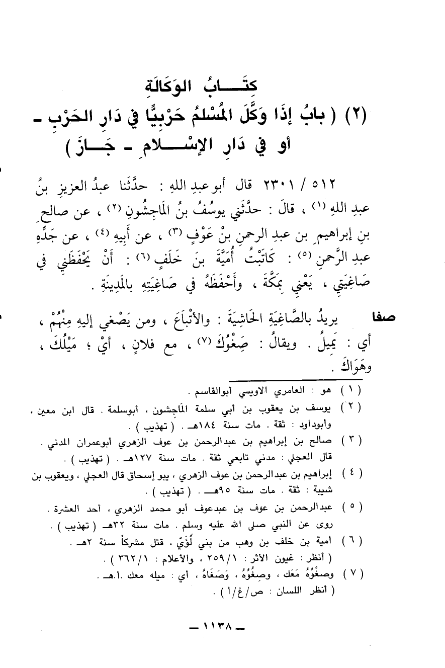 512/ 2301 - قال أبو عبد الله: حدّثنا عبد العزيز بن عبد الله , قال: حدّثني يوسُف بن الماجِشون , عن صالح بن إبراهيم بن عبد الرحمن بن عوف , عن أبيه , عن جدِّه عبد الرحمن: كاتبتُ أُمَيَّة بن خَلَف: أن يَحْفَظني في صاغِيتي , يعني بمكة , وأحفظه في صاغيته بالمدينة.