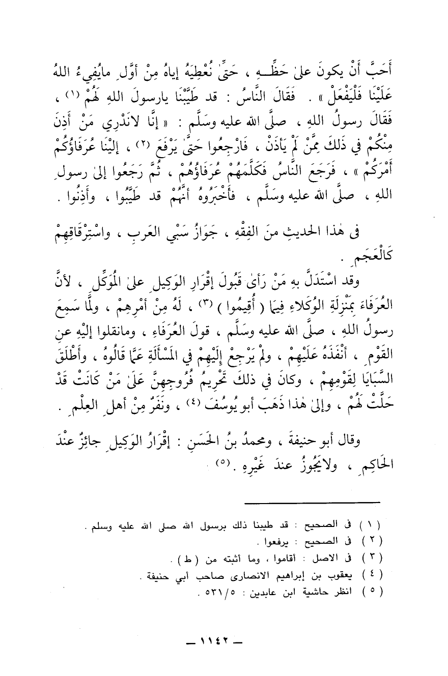 وقد استدَّل به من رأى قَبول إقرار الوكيل على المُوَكِّل , لأنّ العُرفاء بمنزلة الوُكلاء فيما أُقيموا له من أمرهم , ولمّا سَمِع رسول الله , صلى الله عليه وسلم , قول العُرفاء , وما نقلوا إليه عن القوم , أنفَذَه عليهم , ولم يرجِع إليهم في المسألة عمّا قالوه , وأَطلَق السبايا لقومهم , وكان في ذلك تحريم فُروجِهنّ على من كانت قد حَلَّت لهم , وإلى هذا ذهب أبو يوسُف , ونفر من أهل العلم.