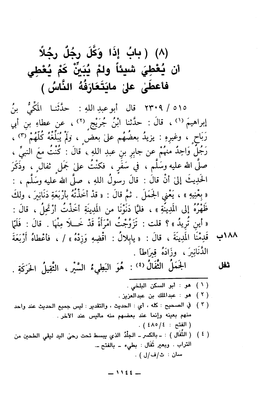 515/ 2309 - قال أبو عبد الله: حدّثنا المَكِّي بن إبراهيم , قال: حدّثنا ابنُ جُريج , عن عطاء بن أبي رباح , وغيره: يزيد بعضُهم على بعض , ولم يُبَلِّغه كلهم , رجل واحد منهم عن جابر بن عبد الله , قال: كنت مع النبي , صلى الله عليه وسلم , في سَفَر , فكنت على جمل ثفال , وذكر الحديث إلى أن قال: قال رسول الله , صلى الله عليه وسلم: " بِعْنيه " , يعني الجمل. ثم قال: " قد اخذته بأربعة دنانير , ولك ظَهره إلى المدينة " , فلما دنونا من المدينة أخذتُ أرتَحِل , قال: " أين تُريد "؟ قلت: تزوّجتُ امرأة قد خلا منها. قال: فلمّا قدِمنا المدينة , قال: " يا بِلال: اقضِه وزِده " , فأعطاه أربعة الدنانير , وزاده قيراطا.