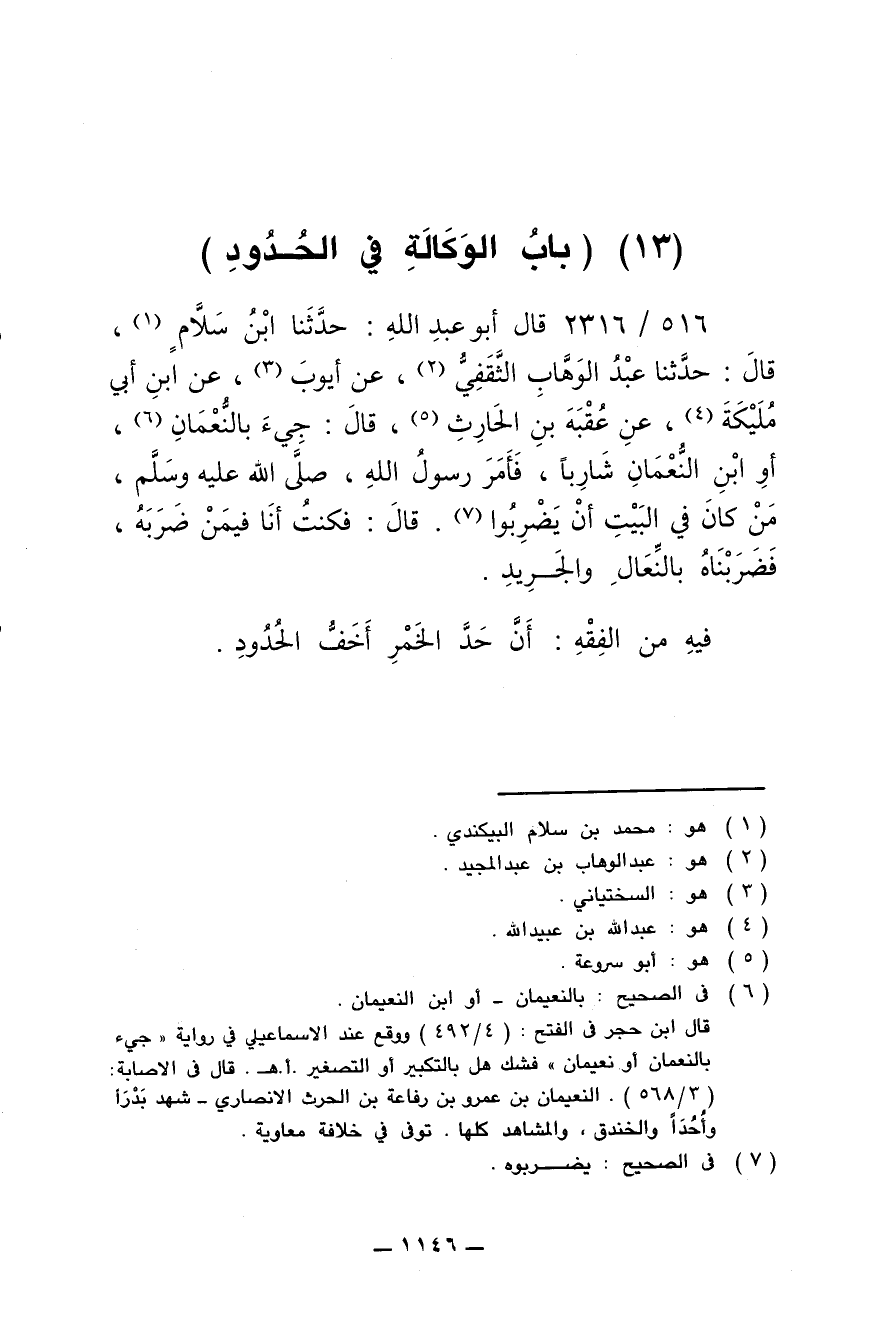 516/ 2316 - قال أبو عبد الله: حدّثنا ابن سَلّام , قال: حدّثنا عبد الوهاب الثَّقفي , عن أيوب , عن ابن أبي مُليكة , عن عُقبة بن الحارِث , قال: جيء بالنعمان , أو ابن النُّعمان شارِبا , فأمر رسول الله , صلى الله عليه وسلم , مَن كان في البيت أن يَضرِبوا. قال: فكُنت أنا فيمن ضربه , فضربناه بالنِّعال والجَريد.