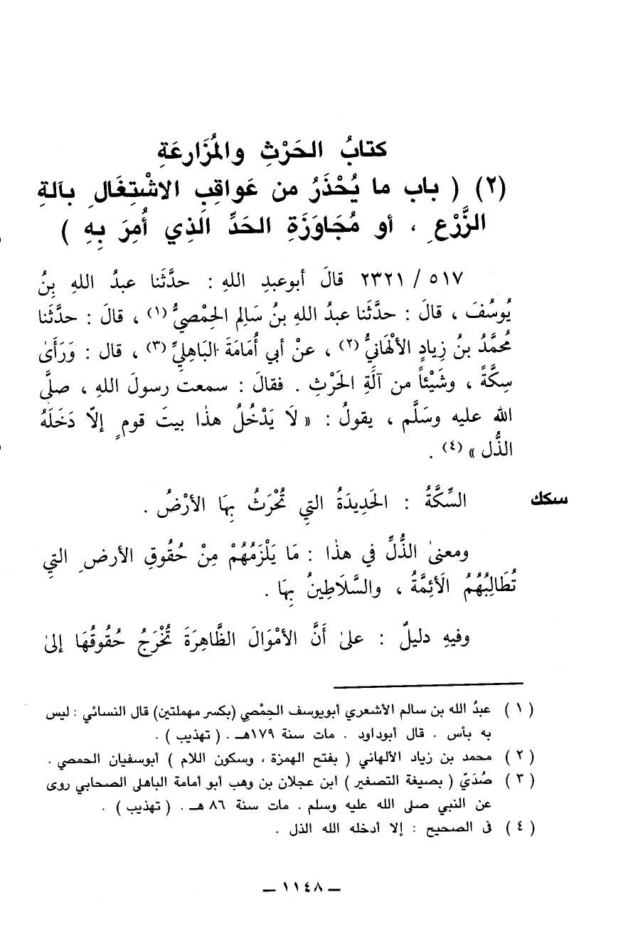 517/ 2321 - قال أبو عبد الله: حدّثنا عبد الله بن يوسُف , قال: حدّثنا عبد الله بن سالِم الحِمصيّ , قال: حدّثنا محمد بن زِياد الألْهانيّ , عن أبي أُمامة الباهليّ , قال: ورأى سِكَّة , وشيئا من آلة الحَرث. فقال: سمعت رسول الله , صلى الله عليه وسلم , يقول: " لا يَدخُل هذا بيت قوم إلا دخله الذُّل ".