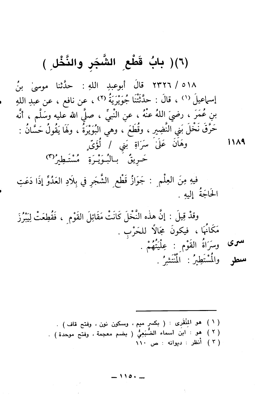 518/ 2326 - قال أبو عبد الله: حدّثنا موسى بن إسماعيل , قال: حدّثتنا جُوَيْرِيَة , عن نافع , عن عبد الله بن عُمر , رضي الله عنه , عن النبي , صلى الله عليه وسلم , أنه حَرَّق نخل بني النَّضير , وقُطَع , وهي البُوَيْرَة , ولها يقول حسّان: