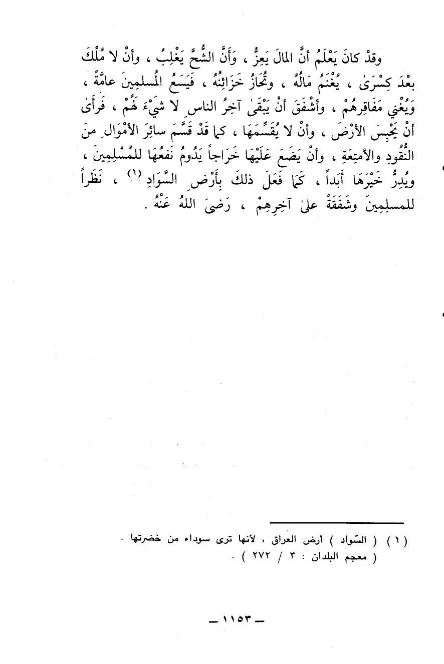 وقد كان يعلم أنّ المال يَعِزّ , وأنّ الشُّح يغلِب , وأن لا مُلك بعد كِسرى , يُغنَم ماله , وتُحاز خزائنه , فيسَع المسلمين عامة , ويُغني مفاقِرهم , وأشفق أن يبقى آخر الناس لا شيء لهم , فرأى أن يحبس الأرض , وأن لا يُقَسِّمها , كما قد قَسَّم سائر الأموال من النقود والأمتعة , وأن يضع عليها خراجا يدوم نفعها للمسلمين , ويُدِرّ خيرها أبدا , كما فعل ذلك بأرض السّواد , نظرا للمسلمين وشفقة على آخرهم , رضي الله عنه.
