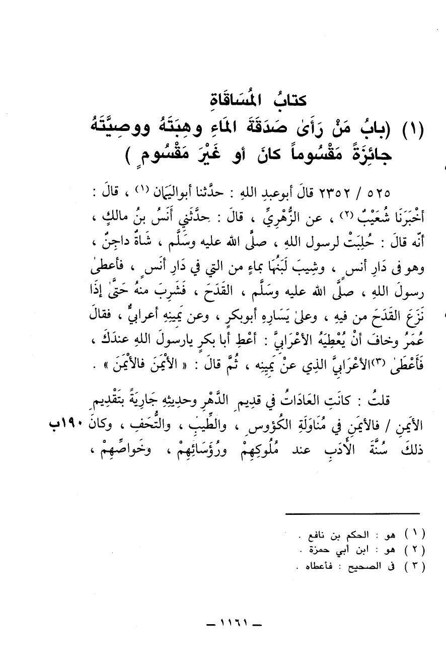 525/ 2352 - قال أبو عبد الله: حدّثنا أبو اليَمان , قال: أخبرنا شُعَيب , عن الزُّهْري , قال: حدّثني أنس بن مالك , أنه قال: حُلِبَت لرسول الله , صلى الله عليه وسلم , شاة داجِن , وهو في دار أنس , وشِيب لبنها بماء من التي في دار أنس , فأعطى رسول الله , صلى الله عليه وسلم , القَدَح , فشرِب منه حتى إذا نَزَع القدح من فيه , وعلى يساره أبو بكر , وعن يمينه أعرابيّ , فقال عُمَر وخاف أن يُعطيه الأعرابي: أعْطِ أبا بكر يا رسول الله عندك , فأعطى الأعرابيّ الذي عن يمينه , ثم قال: " الأيمن فالأيمن ".