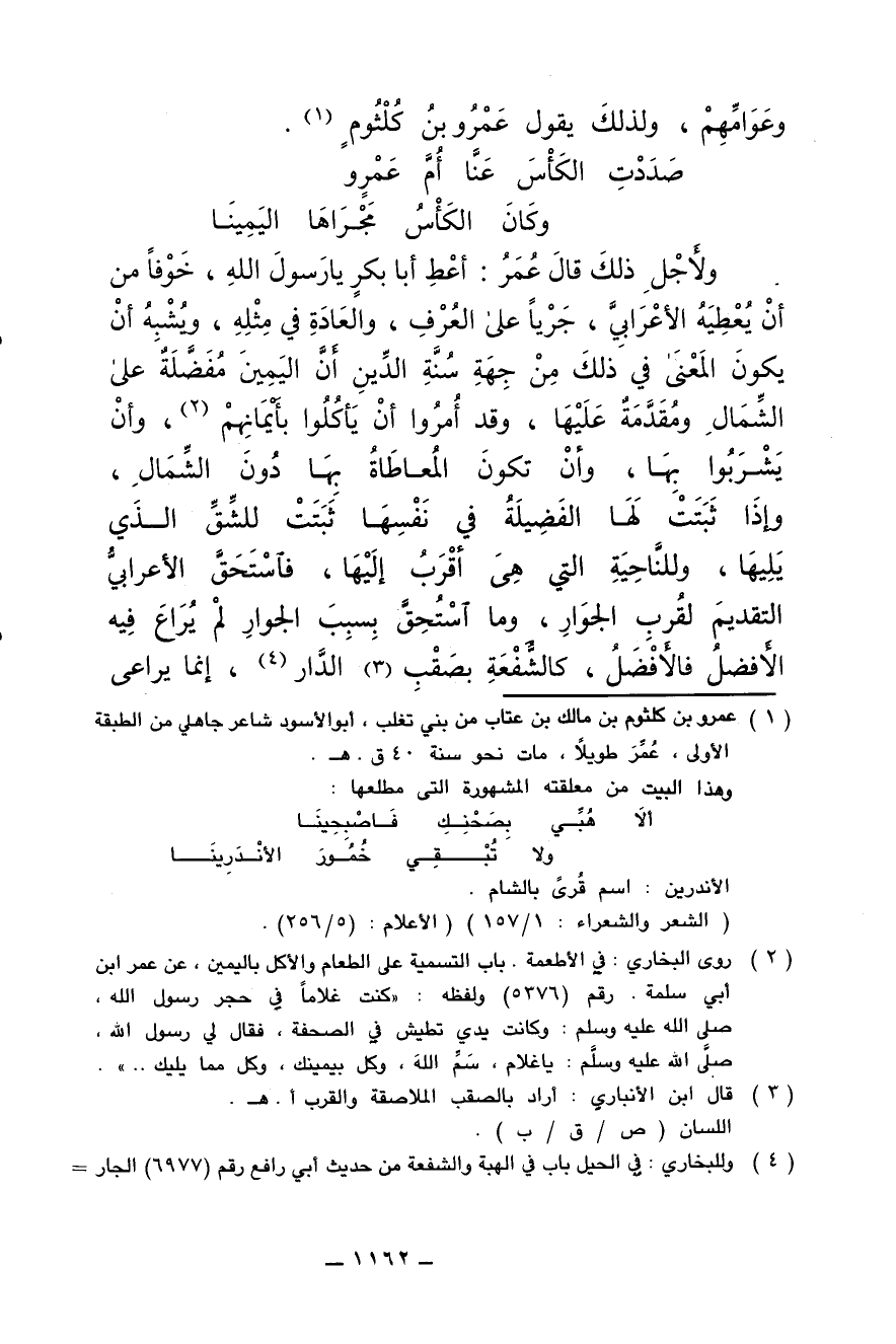 ولأجل ذلك قال عُمر: أعطِ أبا بكر يا رسول الله , خوفا من أن يعطيه الأعرابي , جَريا على العُرف , والعادة في مثله , ويُشبه أن يكون المعنى في ذلك من جهة سُنّة الدين أن اليمين مُفضّلة على الشمال ومُقدّمة عليها , وقد اُمِروا أن يأكلوا بأَيمانهم , وأن يشربوا بها , وأن تكون المُعاطاة بها دون الشمال , وإذا ثبتت لها الفضيلة في نفسها ثبتت للشِّق الذي يليها , وللناحية التي هي أقرب إليها , فاستحقّ الأعرابي التقديم لقُرب الجِوار , وما استُحِق بسبب الجِوار لم يُراعَ فيه الأفضل فالأفضل , كالشُّفعة بصَقْب الدار , إنما يُراعى
