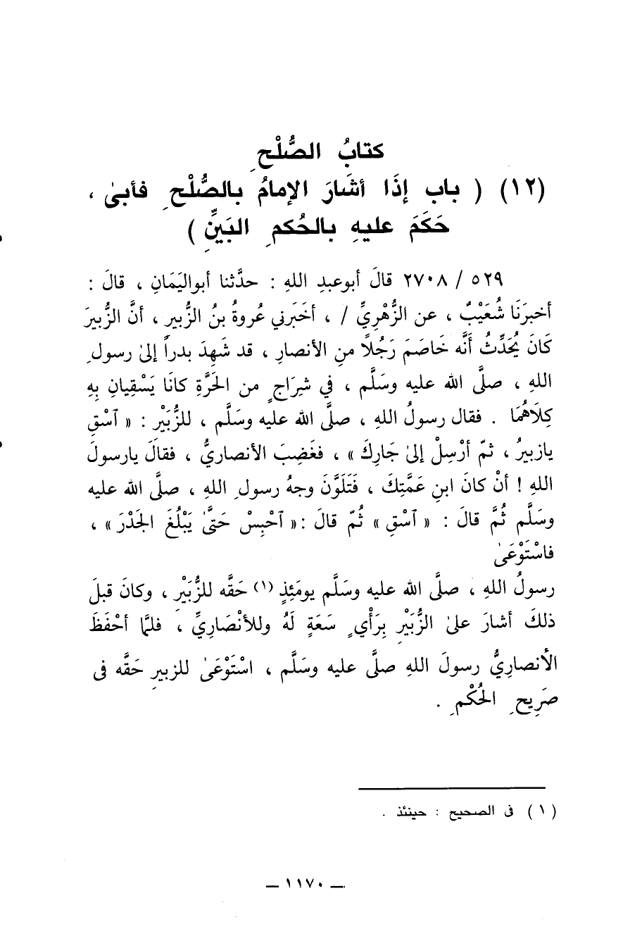 529/ 2708 - قال أبو عبد الله: حدّثنا أبو اليَمان , قال: أخبرنا شُعَيب , عن الزُّهْري , أخبرني عُروة بن الزّبير , أنّ الزبير كان يُحدّث أنه خاصم رجلا من الأنصار , قد شَهِد بدرًا , إلى رسول الله , صلى الله عليه وسلم , في شِراج من الحَرَّة كانا يسقيان به كلاهما. فقال رسول الله , صلى الله عليه وسلم , للزبير: " اسقِ يا زبير , ثم أرسِل إلى جارك " , فغضِب الأنصاري , فقال: يا رسول الله! أن كان ابن عمّتك , فتلوّن وجه رسول الله , صلى الله عليه وسلم , ثم قال: " اسق " ثم قال: " احبِس حتى يبلُغ الجَدْر " , فاستوعى رسول الله , صلى الله عليه وسلم , يومئذ حقه للزبير , وكان قبل ذلك أشار على الزبير برأي سَعَة له وللأنصاري , فلمّا أحْفَظ الأنصاري رسول الله صلى الله عليه وسلم , استوعى للزبير حقّه في صَريح الحُكم.