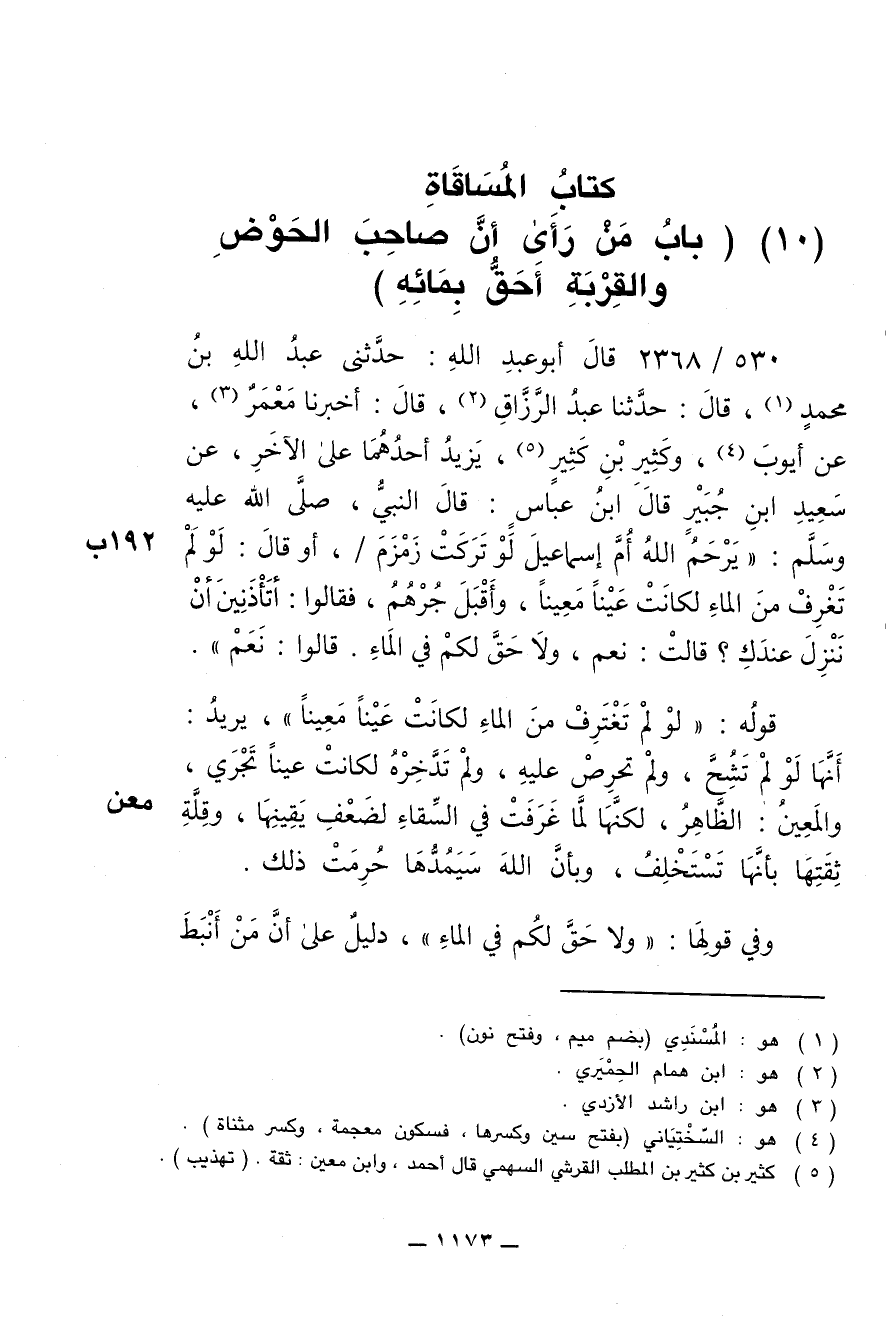 530/ 2368 - قال أبو عبد الله: حدّثني عبد الله بن محمد , قال: حدثنا عبد الرزّاق , قال: أخبرنا مَعْمَر , عن أيوب , وكَثير بن كَثير , يزيد أحدهما على الآخر , عن سعيد ابن جُبير قال ابن عبّاس: قال النبي , صلى الله عليه وسلم: " يرحم الله أمَّ إسماعيل لو تركت زمزم , أو قال: لو لم تَغرِف من الماء لكانت عينا مَعينا , وأقبل جُرْهُم , فقالوا: أتأذنين أن ننزل عندك؟ قالت: نعم , ولا حقّ لكم في الماء. قالوا: نعم ".
