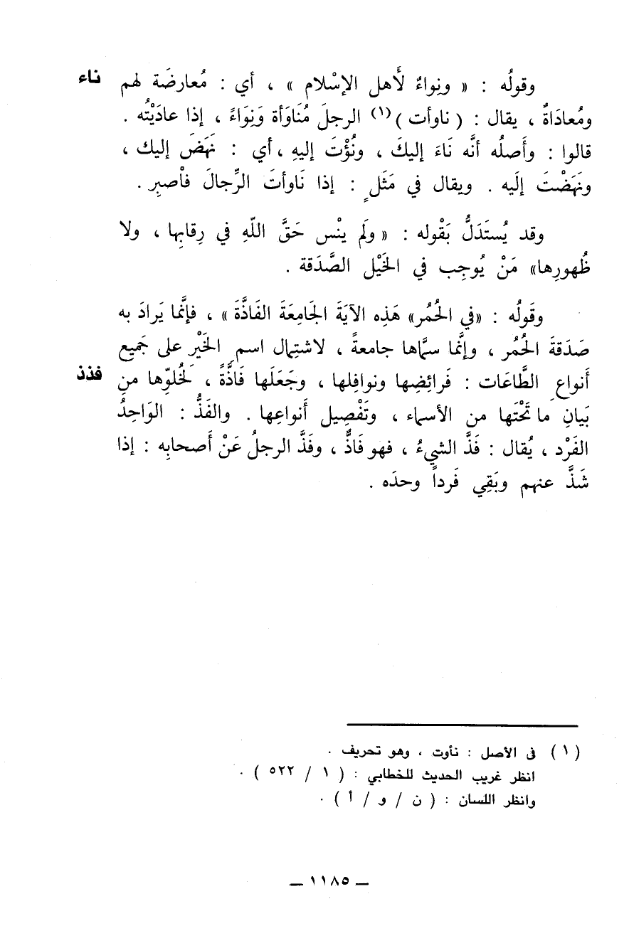 وقوله: " ونِواء لأهل الإسلام " , أي: مُعارضَة لهم ومُعاداة , يقال: ناوأت الرجل مُناوأة ونِواء , إذا عاديته. قالوا: وأصله أنه ناء إليك , ونُؤت إليه , أي: نهض إليك , ونهضت إليه. ويقال: في مَثَل: إذا ناوأتَ الرجال فاصبر.
