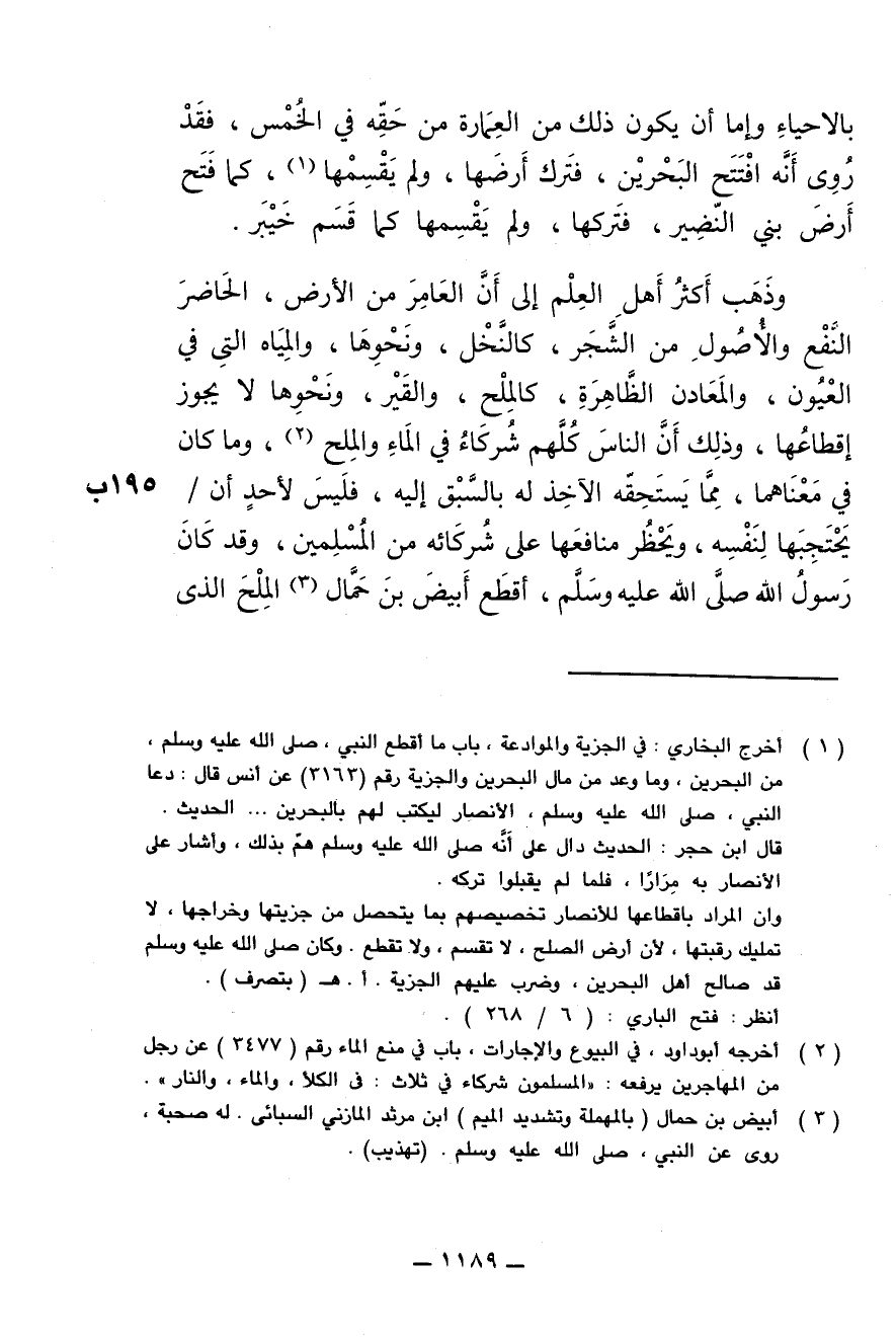 وذهب أكثر أهل العلم إلى أن العامِر من الأرض , الحاضر النفع والأصول من الشّجَر , كالنّخل , ونحوها , والمياه التي في العُيون , والمعاد الظاهر , كالمِلح , والقَير , ونحوها لا يجوز إقطاعها , وذلك أنّ الناس كلهم شركاء في الماء والمِلح , وما كان في معناهما , مما يستحقه الآخِذ له بالسبق إليه , فليس لأحد أن يحتجِبها لنفسه , ويَحظُر منافعها على شُركائه المسلمين , وقد كان رسول الله , صلى الله عليه وسلم , أقطَع أبيض بن حَمَّال المِلح الذي