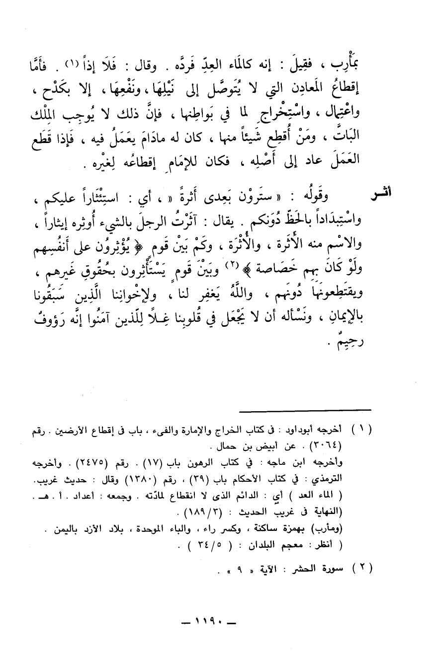 بِمأربِ , فقيل: إنه كالماء العِدّ فرَدَّه. وقال: فلا إذًا. فأما إقطاع المعادن التي لا يُتَوصّل إلى نيلها , ونفعها , إلا بكدح , واعتِمال , واستخراج لما في بواطنها , فإن ذلك لا يوجب المِلْك الباتّ , ومن أُقطِع شيئا منها , كان له ما دام يعمل فيه , فإذا قَطَع العمل عاد إلى أصله , فكان للإمام إقطاعه لغيره.