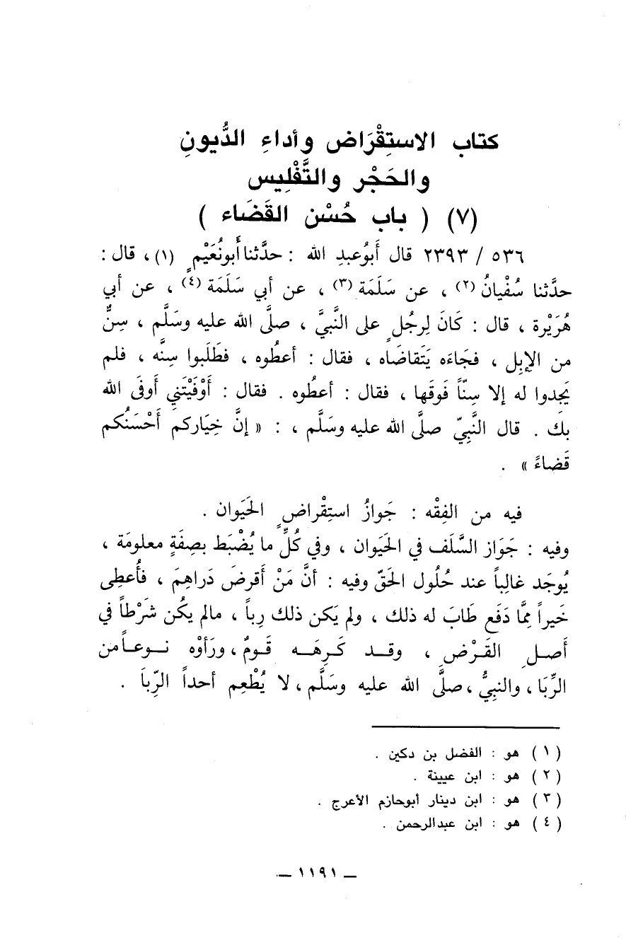 536/ 2393 - قال أبو عبد الله: حدّثنا أبو نُعيم , قال: حدّثنا سُفيان , عن سَلَمة , عن أبي سَلَمة , عن أبي هريرة , قال: كان لرجل على النبي , صلى الله عليه وسلم , سِنٌّ من الإبِل , فجاءه يتقاضاه , فقال: أعطوه , فطلبوا سِنّه , فلم يجدوا له إلا سِنًّا فوقها , فقال: أعطوه. فقال: أوفَيتَني أوفى الله بك. قال النبي صلى الله عليه وسلم: " إنّ خِياركم أحسنكم قضاء ".