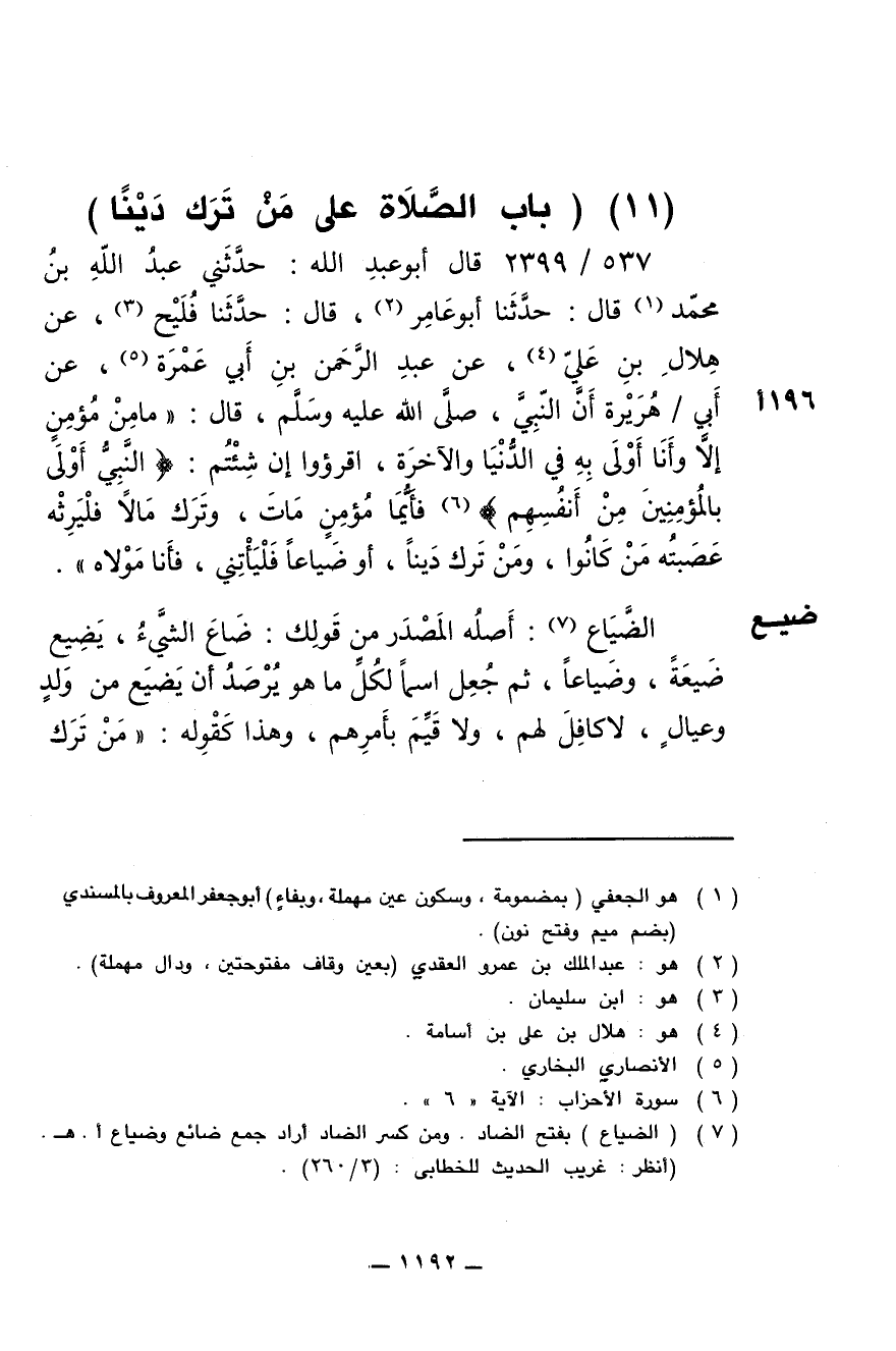 537/ 2399 - قال أبو عبد الله: حدّثني عبد الله بن محمد قال: حدّثنا أبو عامِر , قال: حدّثنا فُلَيح , عن هِلال بن عليّ , عن عبد الرحمن بن أبي عَمْرة , عن أبي هريرة أن النبي , صلى الله عليه وسلم , قال: " ما مِن مؤمن إلا وأنا أولى به في الدنيا والآخرة , اقرؤوا إن شئتم: {النبي أولى بالمؤمنين من أنفسهم} فأيما مؤمن مات , وترك مالا فليَرِثه عَصَبته من كانوا , ومَن ترك دَينا , أو ضَياعا فليأتني , فأنا مولاه ".