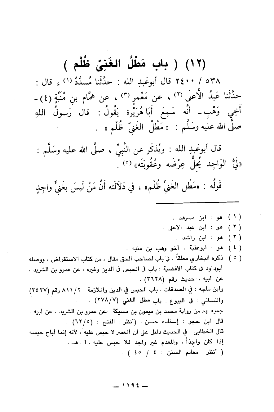 538/ 2400 - قال أبو عبد الله: حدّثنا مُسدَّد , قال: حدّثنا عبد الأعلى , عن مَعْمَر , عن هَمَّام بن مُنَبِّه - أخي وَهْب - أنه سمِع أبا هُريرة يقول: قال رسول الله صلى الله عليه وسلم: " مَطْل الغنيّ ظُلْم ".