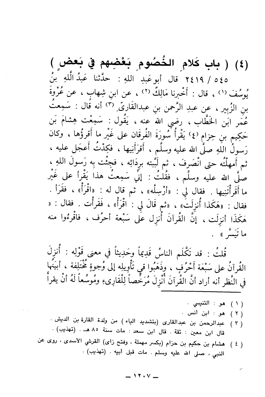 545/ 2419 - قال أبو عبدالله: حدثنا عبدالله بن يوسف، قال: أخبرنا مالك، عن ابن شهاب، عن عروة بن الزبير، عن عبدالرحمن بن عبد القارئ أنه قال: سمعت عمر ابن الخطاب، رضي الله عنه، يقول: سمعت هشام بن حكيم بن حزام يقرأ سورة الفرقان على غير ما أقرؤها، وكان رسول الله صلى الله عليه وسلم، أقرأنيها، فكدت أعجل عليه، ثم أمهلته حتى انصرف، ثم لببته بردائه، فجئت به رسول الله، صلى الله عليه وسلم، فقلت: إني سمعت هذا يقرأ على غير ما أقرأتنيها. فقال لي: (أرسله) ثم قال له: (اقرأ)، فقرأ. فقال: (هكذا أنزلت)، (ثم قال لي: اقرأ)، فقرأت. فقال: (هكذا أنزلت، إن القرآن أنزل على سبعة أحرف، فاقرءوا منه ما تيسر).