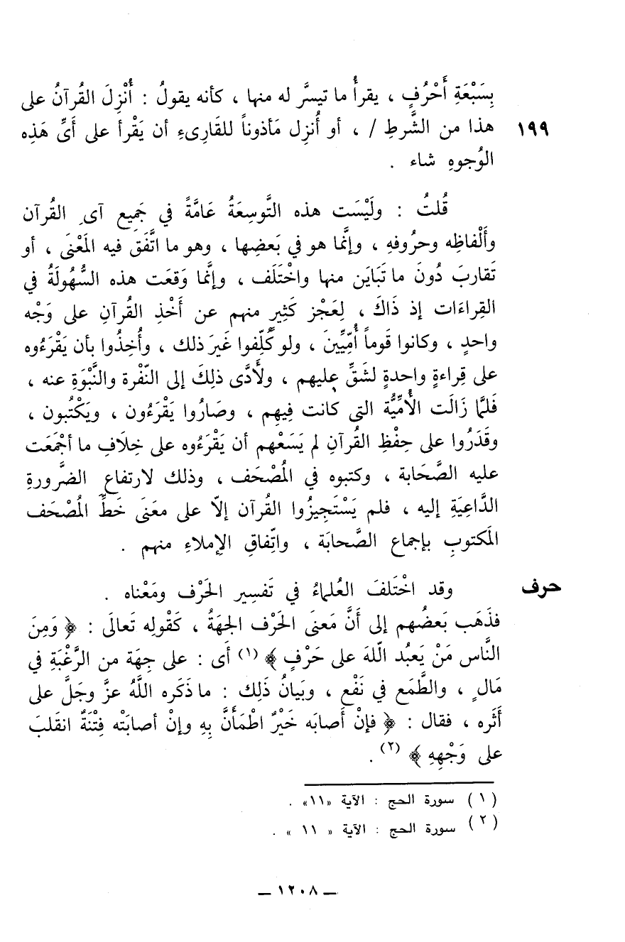 فذهب بعضهم إلى أن معنى الحرف الجهة، كقوله تعالى: {ومن الناس من يعبد الله على حرف} أي: على جهة من الرغبة في مال، والطمع في نفع، وبيان ذلك ما ذكره الله عز وجل على أثره، فقال: {فإن أصابه خير اطمأن به وإن أصابته فتنة انقلب على وجهه}
