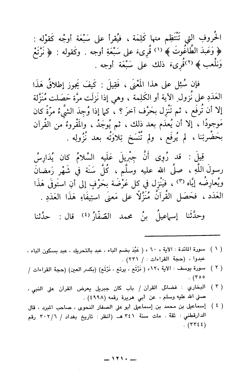 فإن سئل على هذا المعنى، فقيل: كيف يجوز إطلاق هذا العدد على نزول الآية أو الكلمة، وهي إذا نزلت مرة حصلت منزلة إلا أن ترفع، ثم تنزل بحرف آخر؟، كما إذا وجد الشيء مرة كان موجودا، إلا أن يعدم بعد ذلك، ثم يوجد، والمقروء من القرآن بحضرتنا، لم يرفع، ولم تنسخ تلاوته بعد نزوله.