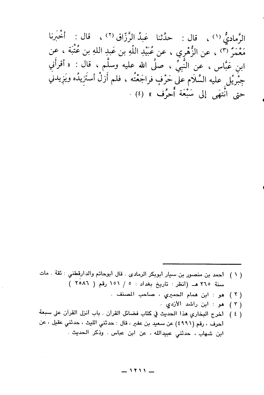 الرمادي، قال: حدثنا عبدالرزاق، قال: أخبرنا معمر، عن الزهري، عن عبيد الله بن عبد الله بن عتبة، عن ابن عباس، عن النبي، صلى الله عليه وسلم، قال: (أقرأني جبريل عليه السلام على حرف فراجعته، فلم أزل أستزيده ويزيدني حتى انتهى إلى سبعة أحرف).