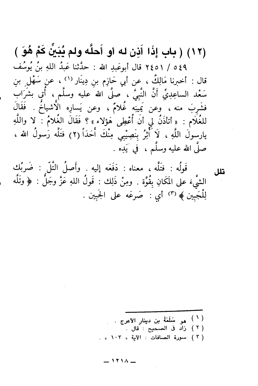 549/ 2451 - قال أبو عبد الله: حدثنا عبد الله بن يوسف قال: أخبرنا مالك، عن أبي حازم بن دينار، عن سهل بن سعد الساعدي أن النبي، صلى الله عليه وسلم، أتى بشراب فشرب منه، وعن يمينه غلام، وعن يساره الأشياخ. فقال للغلام (أتأذن لي أن أعطي هؤلاء)؟ فقال الغلام: لا والله يا رسول الله، لا أثر بنصيبي منك أحدا فتله رسول الله، صلى الله عليه وسلم، في يده.