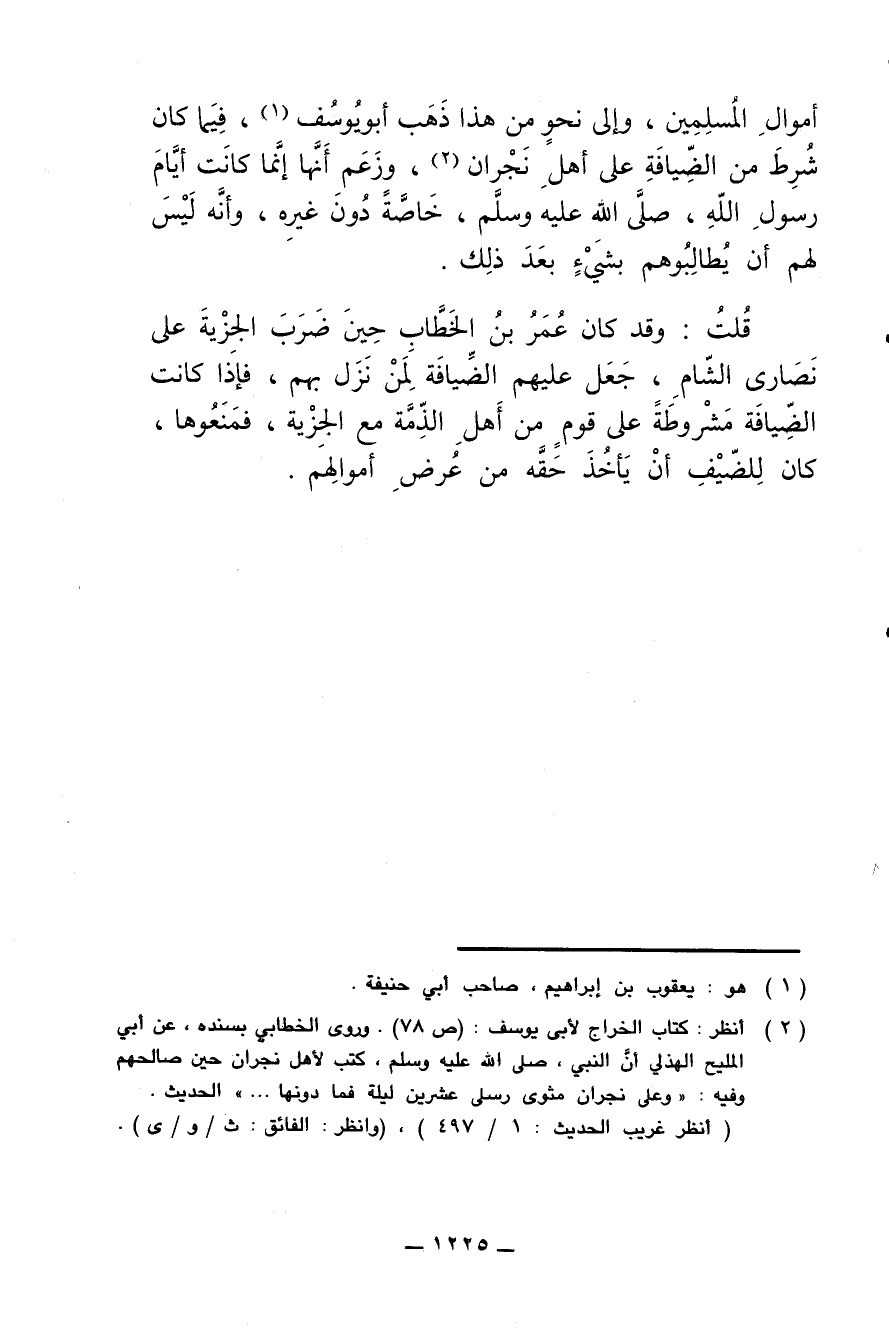 أموال المسلمين، وإلى نحو من هذا ذهب أبو يوسف، فيما كان شرط من الضيافة على أهل نجران، وزعم أنها إنما كانت أيام رسول الله، صلى الله عليه وسلم، خاصة دون غيره، وأنه ليس بهن أن يطالبوهم بشيء بعد ذلك.
