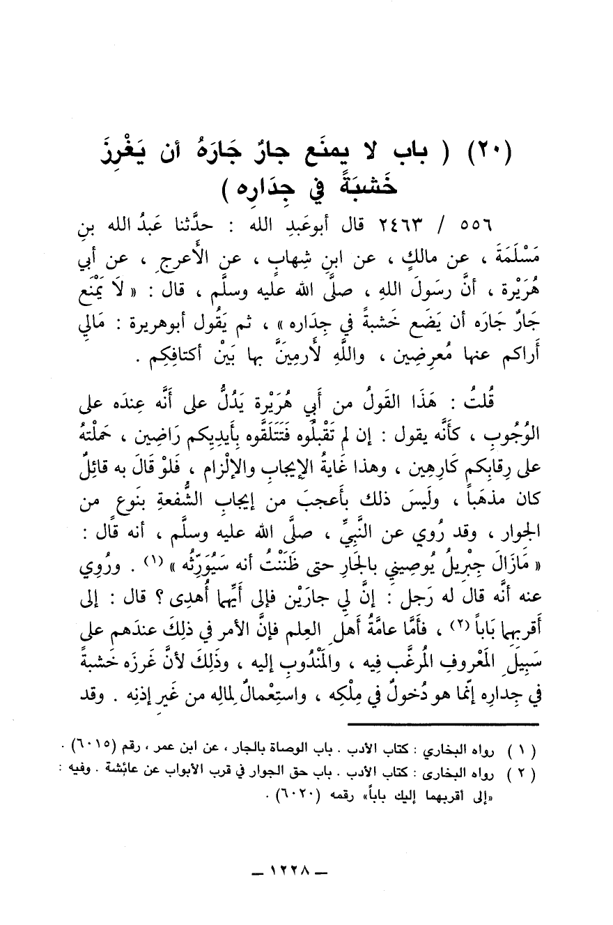 556/ 2463 - قال أبو عبد الله: حدثنا عبد الله بن مسلمة، عن مالك، عن ابن شهاب، عن الأعرج، عن أبي هريرة، أن رسول الله، صلى الله عليه وسلم، قال: (لا يمنع جار جاره أن يضع خشبة في جداره)، ثم يقول أبو هريرة: مالس أراكم عنها معرضين، والله لأرمين بها بين أكتافكم.
