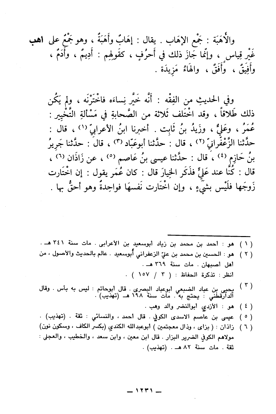 وفي الحديث من الفقه: أنه خير نساءه فاخترنه، ولم يكن ذلك طلاقا، وقد اختلف ثلاثة من الصحابة في مسألة التخيير: عمر، وعلي، وزيد بن ثابت. أخبرنا ابن الأعرابي، قال: حدثنا الزعفراني، قال: حدثنا أبو عباد، قال: حدثنا جرير بن حازم، قال: حدثنا عيسى بن عاصم، عن زاذان، قال: كنا عند علي فذكر الخيار قال: كان عمر يقول: إن اختارت زوجها فليس بشيء، وإن اختارت نفسها فواحدة وهو أحق بها.