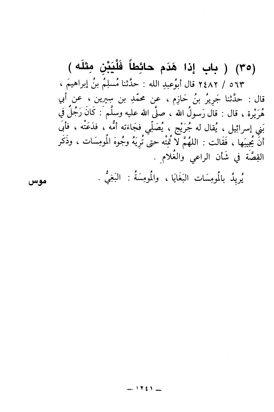 563/ 2482 - قال أبو عبد الله: حدثنا مسلم بن إبراهيم، قال: حدثنا جرير بن حازم، عن محمد بن سيرين، عن أبي هريرة، قال: قال رسول الله، صلى الله عليه وسلم: كان رجل في بني إسرائيل، يقال له جريج، يصلي فجاءته أمه، فدعته، فأبى أن يجيبها، فقالت: اللهم لا تمته حتى تريه وجوه المومسات، وذكر القصة في شأن الراعي والغلام.