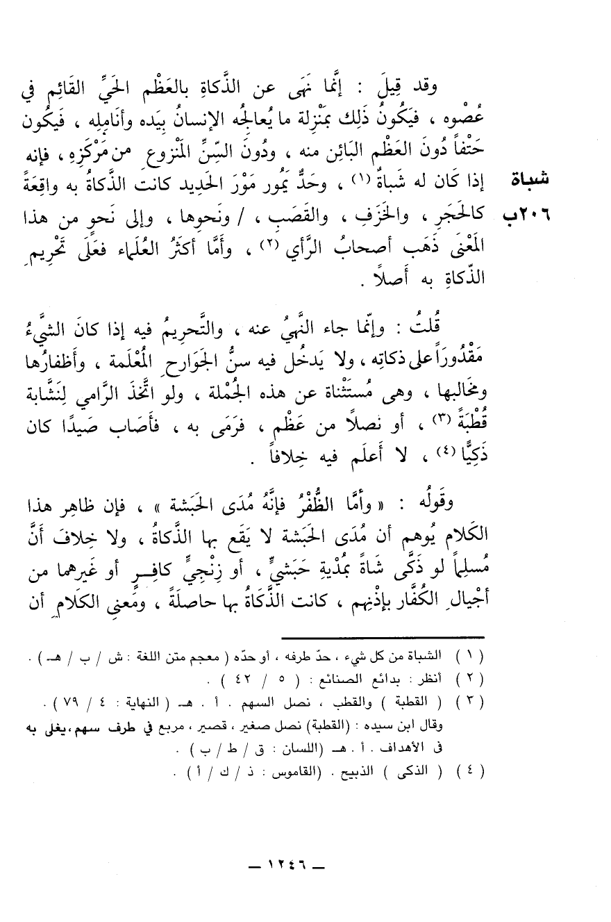 وقوله: ((وأما الظفر فإنه مدى الحبشة)) , فإن ظاهر هذا الكلام يوهم أن مدى الحبشة لا يقع بها الذكاة , ولا خلاف أن مسلماً لو ذكى شاة بمدية حبشي , أو زنجي كافر أو غيرهما من أجيال الكفار بإذنهم , كانت الذكاة بها حاصلة , ومعنى الكلام أن