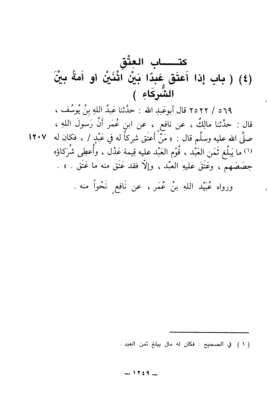 569/ 2522 - قال أبو عبد الله: حدثنا عبد الله بن يوسف , قال: حدثنا مالك , عن نافع , عن ابن عمر أن رسول الله , صلى الله عليه وسلم قال: ((من أعتق شركاً له في عبد / , فكان له ما يبلغ ثمن العبد , قوم العبد قيمة عدل , وأعطى شركاؤه حصصهم , وعتق عليه العبد , وإلا فقد عتق منه ما عتق.)).