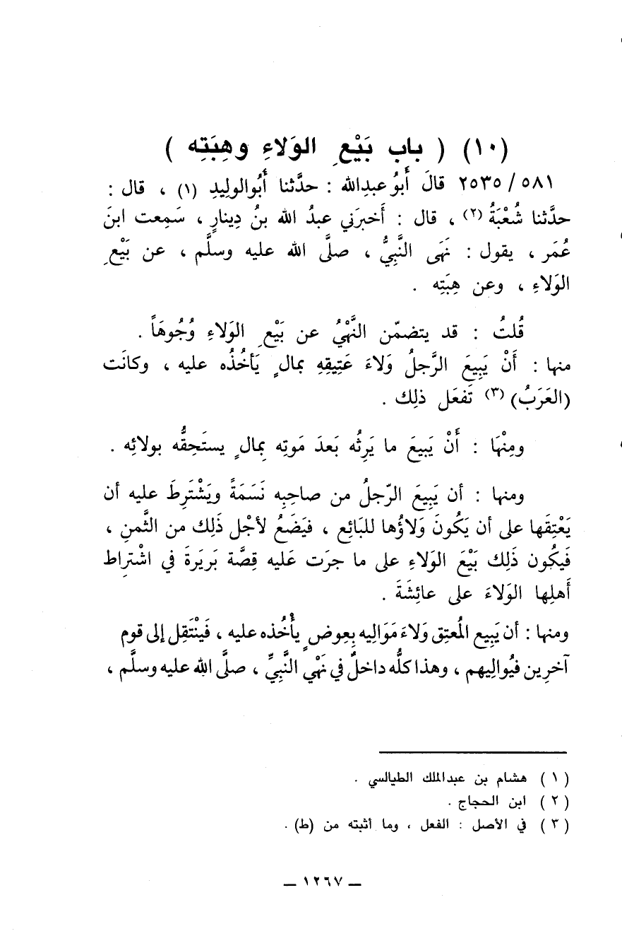 581/ 2535 - قال أبو عبد الله: حدثنا أبو الوليد، قال: حدثنا شعبة، قال: أخبرني عبد الله بن دينار، سمعت ابن عمر، يقول: نهي النبي، صلى الله عليه وسلم، عن بيع الولاء، وعن هبته.