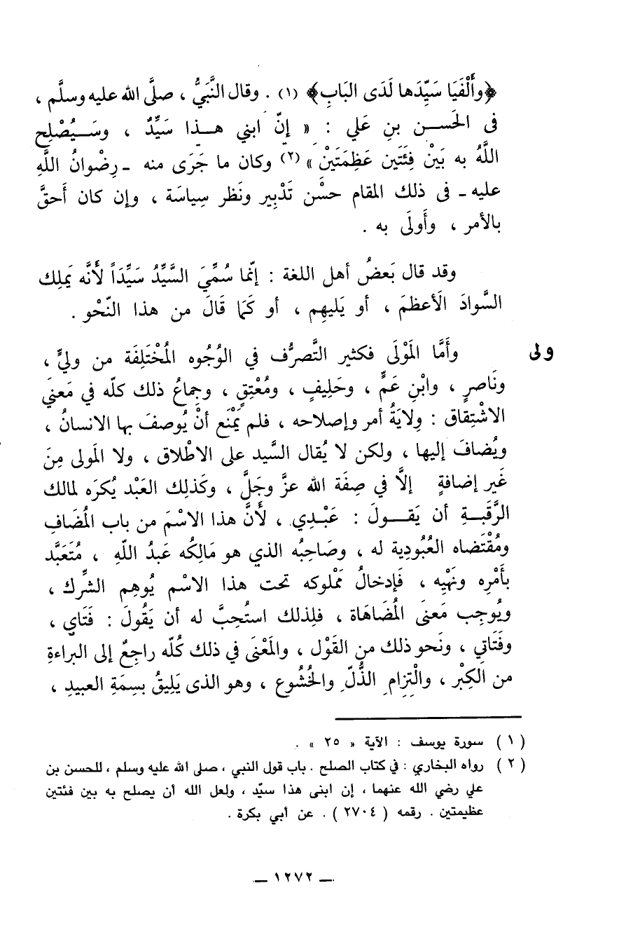 {وألفيا سيدها لدى الباب}. وقال النبي، صلى الله عليه وسلم، في الحسن بن علي: (إن ابني هذا سيد، وسيصلح الله به بين فئتين عظيمتين) وكان ما جرى منه- رضوان الله عليه- في ذلك المقام حسن تدبير ونظر سياسة، وإن كان أحق بالأمر، وأولى به.