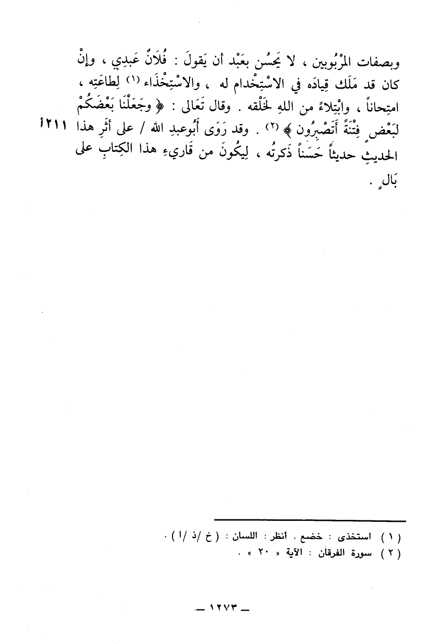 وبصفات المربوبين، لا يحسن بعبد أن يقول: فلان عبدي، وإن كان قد ملك قيادة في الاستخدام له، والاستخذاء لطاعته، امتحانا، وابتلاء من الله لخلقه. وقال تعالى: {وجعلنا بعضكم لبعض فتنة أتبصرون}. وقد روى أبو عبد الله/ على أثر هذا الحديث حديثا حسنا ذكرته، ليكون من قارئ هذا الكتاب على بال.