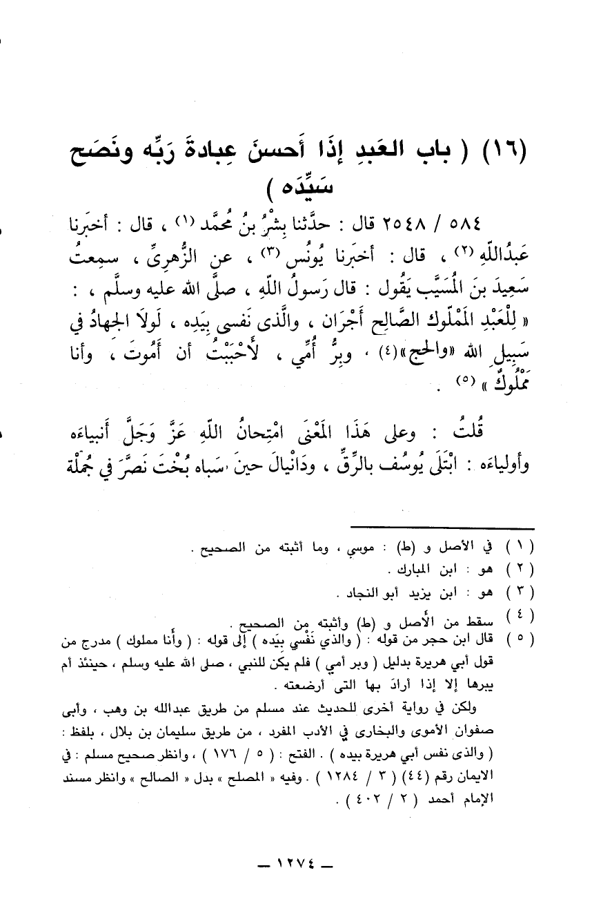 584/ 2548 - قال: حدثنا بشر بن محمد، قال: أخبرنا عبد الله، قال: أخبرنا يونس، عن الزهرى، سمعت سعيد بن المسيب يقول: قال رسول الله، صلى الله عليه وسلم،: (للعبد المملوك الصالح أجران، والذي نفسي بيده، لولا الجهاد في سبيل الله (والحج)، وبر أمي، لأحببت أن أموت، وأنا مملوك).