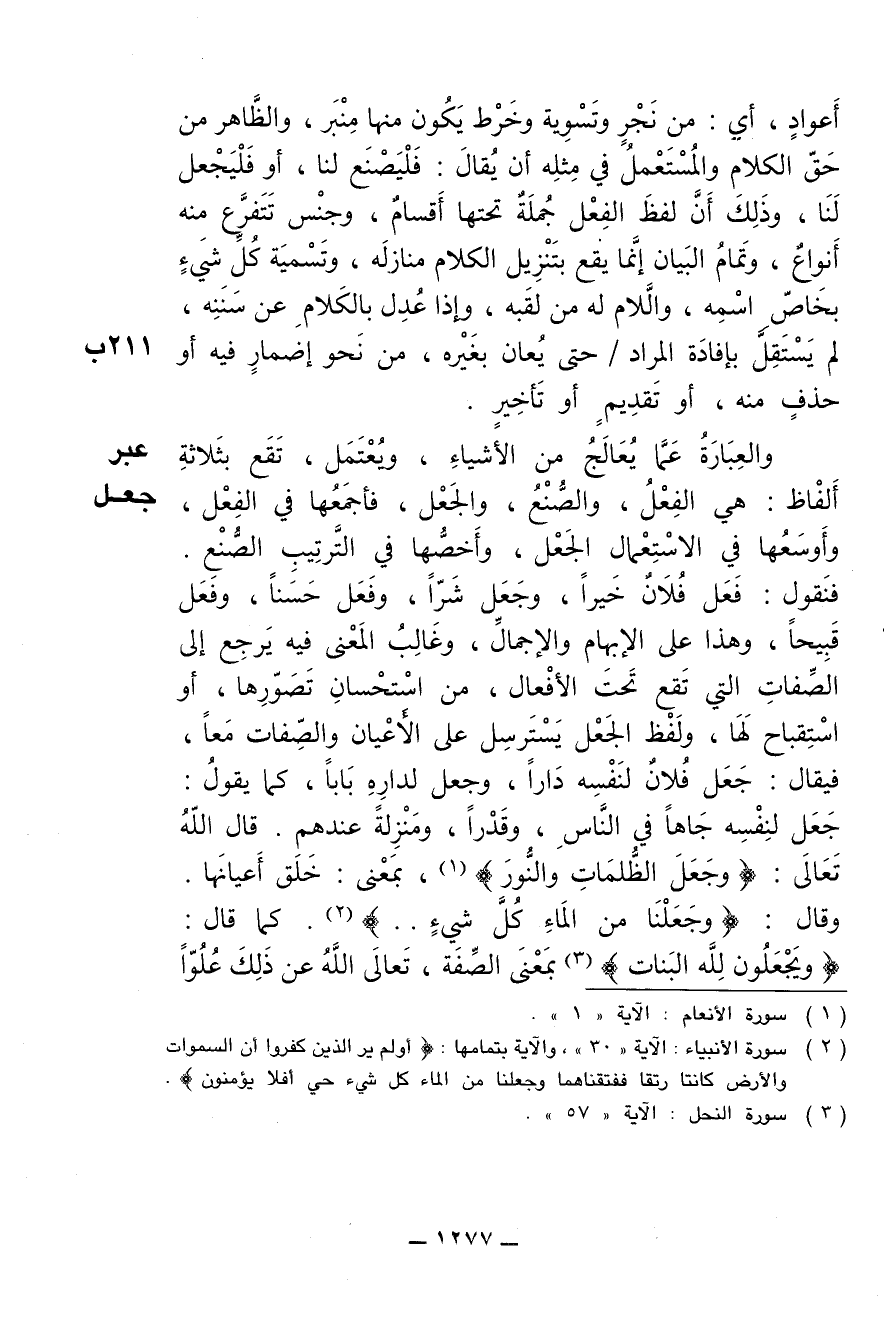 والعبارة عما يعالج من الأشياء، ويعتمل، تقع بثلاثة ألفاظ: هي الفعل، والصنع، والجعل، فأجمعها في الفعل، وأوسعها في الاستعمال الجعل، وأخصها في الترتيب الصنع. فنقول فعل فلان خيرا، وجعل شرا، وفعل حسنا، وفعل قبيحا، وهذا على الإبهام والإجمال، وغالب المعنى فيه يرجع إلى الصفات التي تقع تحت الأفعال، من استحسان تصورها، أو استقباح لها، ولفظ الجعل يسترسل على الأعيان والصفات معا، فيقال: جعل فلان لنفسه دارا، وجعل لداره بابا، كما يقول: جعل لنفسه جاها في الناس، وقدرا، ومنزلة عندهم. قال الله تعالى: {وجعل الظلمات والنور}، بمعنى: خلق أعيانها. وقال: {وجعلنا من الماء كل شيء}. كما قال: {ويجعلون لله البنات} بمعنى الصفة، تعالى الله عن ذلك علوا