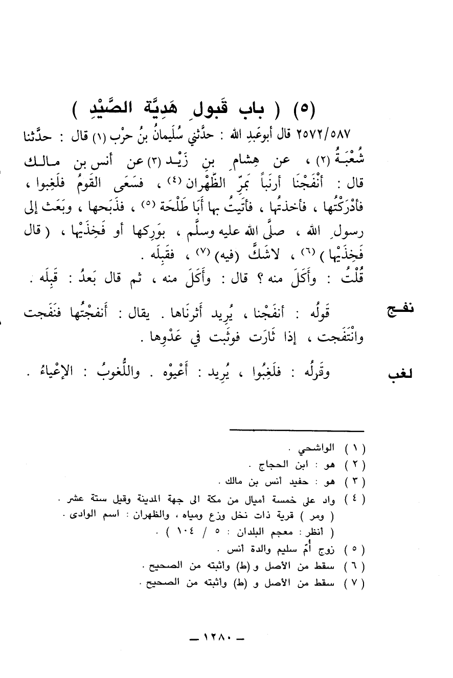 587/ 2572 - قال أبو عبد الله: حدثني سليمان بن حرب قال: حدثنا شعبة، عن هشام بن زيد عن أنس بن مالك قال: أنفجنا أرنبا بمر الظهران، فسعى القوم فلغبوا، فأدركتها، فأخذتها، فأتيت بها أبا طلحة، فذبحها، وبعث إلى رسول الله، صلى الله عليه وسلم، بوركها أو فخذيها، (قال فخذيها)، لاشك (فيه)، فقبله.