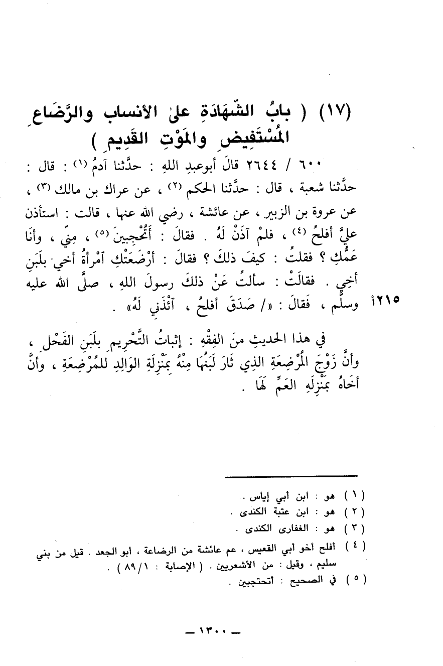 600/ 2644 - قال أبو عبد الله: حدثنا آدم: قال: حدثنا شعبة، قال: حدثنا الحكم، عن عراك بن مالك، عن عروة بن الزبير، عن عائشة، رضي الله عنها، قال: استأذن علي أفلح، فلم آذن له. فقال: أتحجبين، مني، وأنا عمك؟ فقلت: كيف ذلك؟ فقال: أرضعتك امرأة أخي بلبن أخي. فقالت: سألت عن ذلك رسول الله، صلى الله عليه وسلم، فقال: (صدق أفلح، ائذني له).