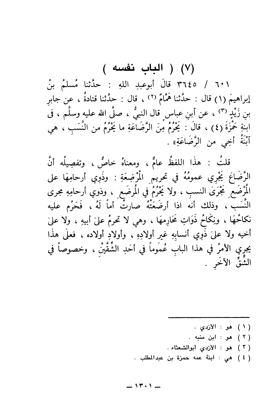 601/ 3645 - قال أبو عبد الله: حدثنا مسلم بن إبراهيم قال: حدثنا همام، قال: حدثنا قتادة، عن جابر بن زيد، عن ابن عباس قال النبي، صلى الله عليه وسلم، في ابنة حمزة، قال: يحرم من الرضاعة ما يحرم من النسب، هي ابنة أخي من الرضاعة).