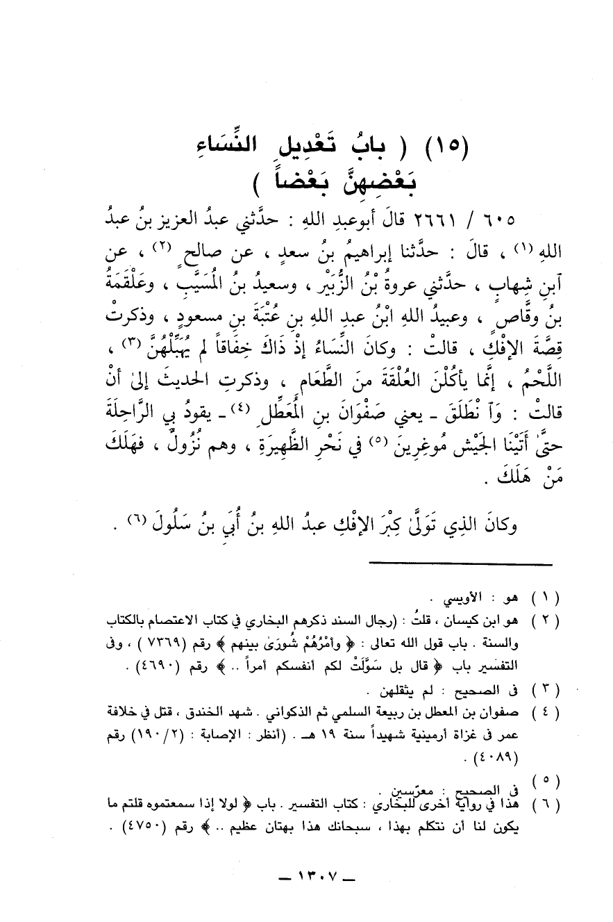 605/ 2661 - قال أبو عبد الله: حدثني عبد العزيز بن عبد الله، قال: حدثنا إبراهيم بن سعد، عن صالح، عن ابن شهاب، حدثني عروة بن الزبير، وسعيد بن المسيب، وعلقمة بن وقاص، وعبيد الله ابن عبد الله بن عتبة بن مسعود، وذكرت قصة الإفك، قالت: وكان النساء إذ ذاك خفاقا لم يهبلهن، اللحم، إنما يأكلن العلقة من الطعام، وذكرت الحديث إلى أن قالت: وانطلق- يعني صفوان بن المعطل- يقود بي الراحلة حتى أتينا الجيش موغرين في نحر الظهيرة، وهم نزول، فهلك من هلك.