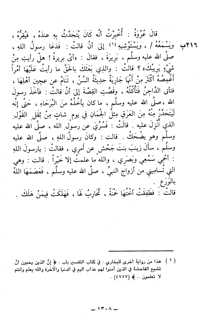 قال عروة: أخبرت أنه كان يتحدث به عنده، فيقره، ويسمعه، ويستوشيه إلى أن قالت: فدعا رسول الله، صلى الله عليه وسلم، بريرة، فقال: (أي بريرة! هل رأيت من شيء يريبك)؟ قالت: والذي بعثك بالحق ما رأيت عليها أمرا أغصه أكثر من أنها جارية حديثة السن، تنام عن عجين أهلها، فتأتى الداجن فتأكله، وقصت القصة إلى أن قالت: فأخذ رسول الله، صلى الله عليه وسلم، ما كان يأخذه من البرحاء، حتى إنه ليتحدر منه من العرق مثل الجمان في يوم شات من ثقل القول الذي أنزل عليه. قالت: فسري عن رسول الله، صلى الله عليه وسلم وهو يضحك. قالت: وكان رسول الله، صلى الله عليه وسلم، سأل زينب بنت جحش عن أمري، فقالت: يا رسول الله: أحمي سمعي وبصري، والله ما علمت إلا خيرا. قالت: وهي التي تساميني من أزواج النبي، صلى الله عليه وسلم، فعصهما الله بالورع.