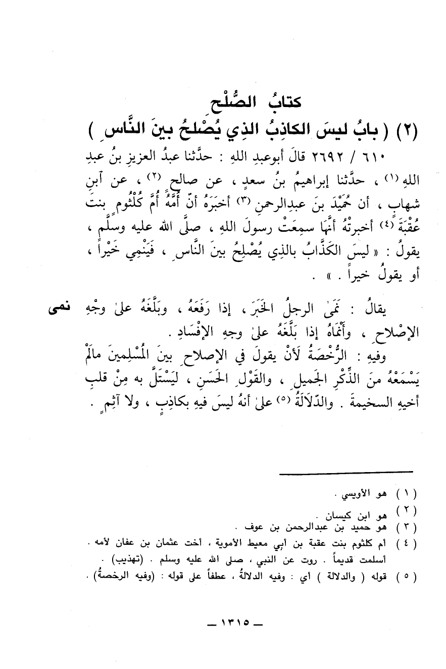610/ 2692 - قال أبو عبد الله: حدثنا عبد العزيز بن عبد الله، حدثنا إبراهيم بن سعد، عن صالح، عن ابن شهاب، أن حميد بن عبد الرحمن أخبره أن أمه أم كلثوم بنت عقبة أخبرته أناه سمعت رسول الله، صلى الله عليه وسلم، يقول: (ليس الكذاب الذي يصلح بين الناس، فينمي خيرا، أو يقول خيرا.).