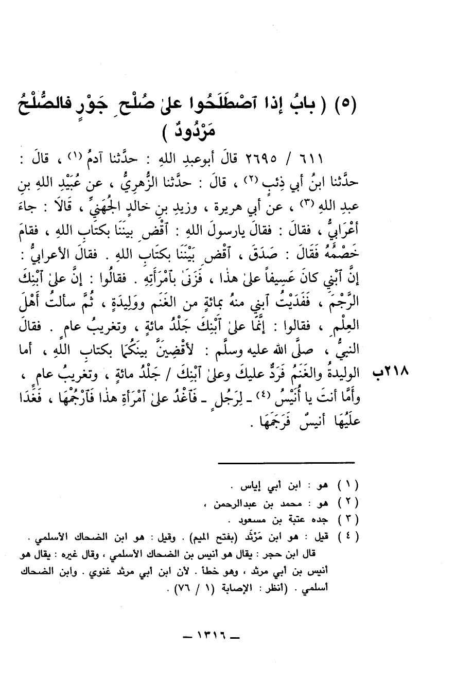 611/ 2695 - قال أبو عبد الله: حدثنا آدم، قال: حدثنا ابن أبي ذئب، قال: حدثنا الزهري، عن عبيد الله بنعبد الله، عن أبي هريرة، وزيد بن خالد الجهني، قالا: جاء إعرابي، فقال: فقال يا رسول الله: أقض بيننا بكتاب الله، فقام خصمه فقال: صدق، أقض بيننا بكتاب الله. فقال الأعرابي: إن ابني كان عسيفا على هذا، فزنى بامرأته. فقالوا: إن على ابنك الرجم، ففديت ابني منه بمائة من الغنم ووليدة، ثم سألت أهل العلم، فقالوا: إنما على ابنك جلد ماة، وتغريب عام. أما الوليدة والغنم فرد عليك وعلى ابنك/ جلد مائة، وتغريب عام، وأما أنت يا أنيس- لرجل- فاغد على امرأة هذا فارجمها، فغدا عليها أنيس فرجمها.
