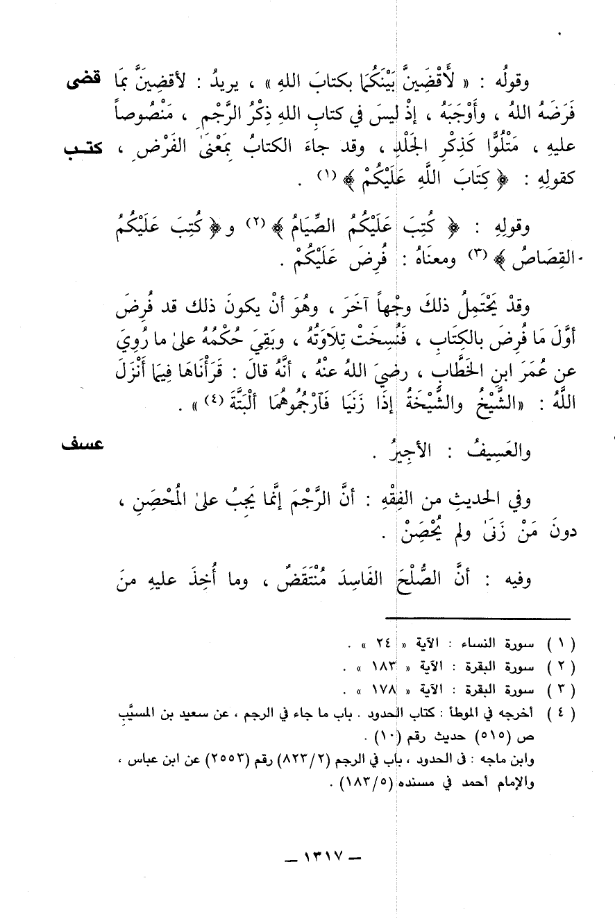 وقد يحتمل ذلك وجها آخر، وهو أن يكون ذلك قد فرض أول ما فرض بالكتاب، فنسخت تلاوته، وبقى حكمه على ما روي عن عمر ابن الخطاب، رضي الله عنه، أنه قال: قرأناها فيما أنزل الله: (الشيخ والشيخة إذا زنيا فارجموهما ألبتة).