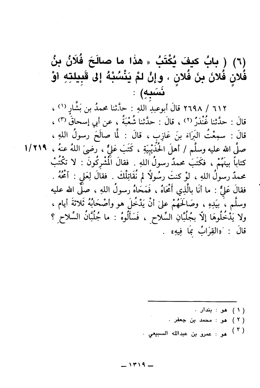 (6) (باب كيف يكتب (هذا ما صالح فلان بن فلان فلان بن فلان، وإن لم ينسبه إلى قبيلته أو نسبه):
