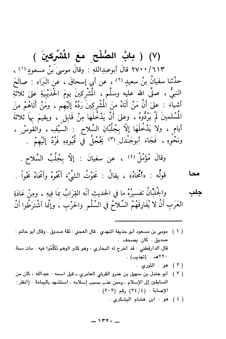 613/ 2700 - قال أبو عبد الله: وقال موسى بن مسعود، حدثنا سفيان بن سعيد، عن أبي إسحاق، عن البراء: صالح النبي، صلى الله عليه وسلم، المشركين يوم الحديبية على ثلاثة أشياء: على أن من أتاه من المشركين رده إليهم، ومن أتاهم من المسلمين لم يردوه، وعلى أن يدخلها من قابل، ويقيم بها ثلاثة أيام، ولا يدخلها إلا بجلبان السلاح: السيف، والقوس، ونحوه، فجاء أبو جندل يخجل في قيوده فرد إليهم.