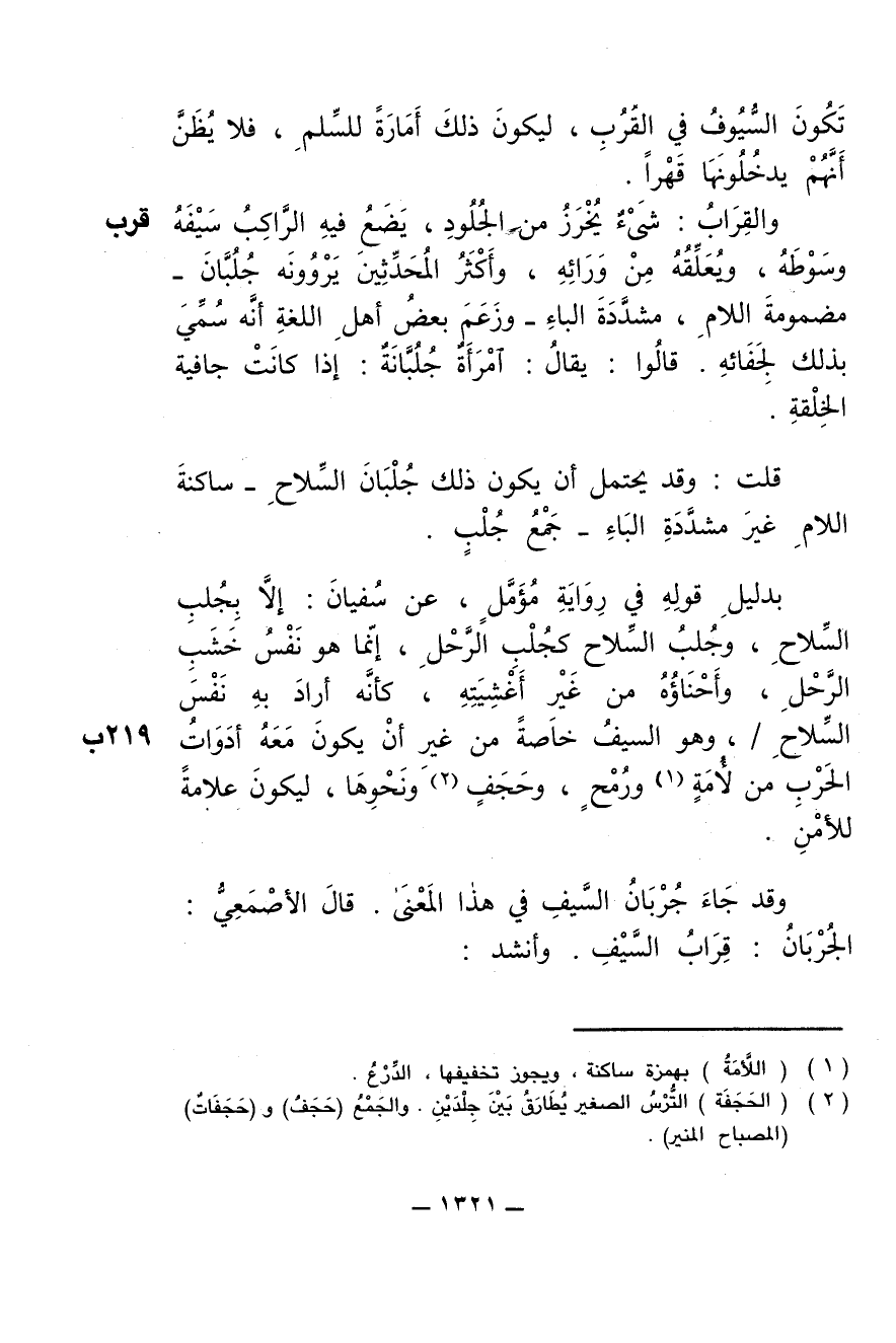 والقراب: شيء يخرز من الجلود، يضع فيه الراكب سيفه وسوطه، ويلعقه من ورائه، وأكثر المحدثين يروونه جلبان- مضمومة اللام، مشدة الباء- وزعم بعض أهل اللغة أنه سمي بذلك لجفائه. قالوا: يقال: امرأة جلبانة: إذا كانت جافية الخلقة.